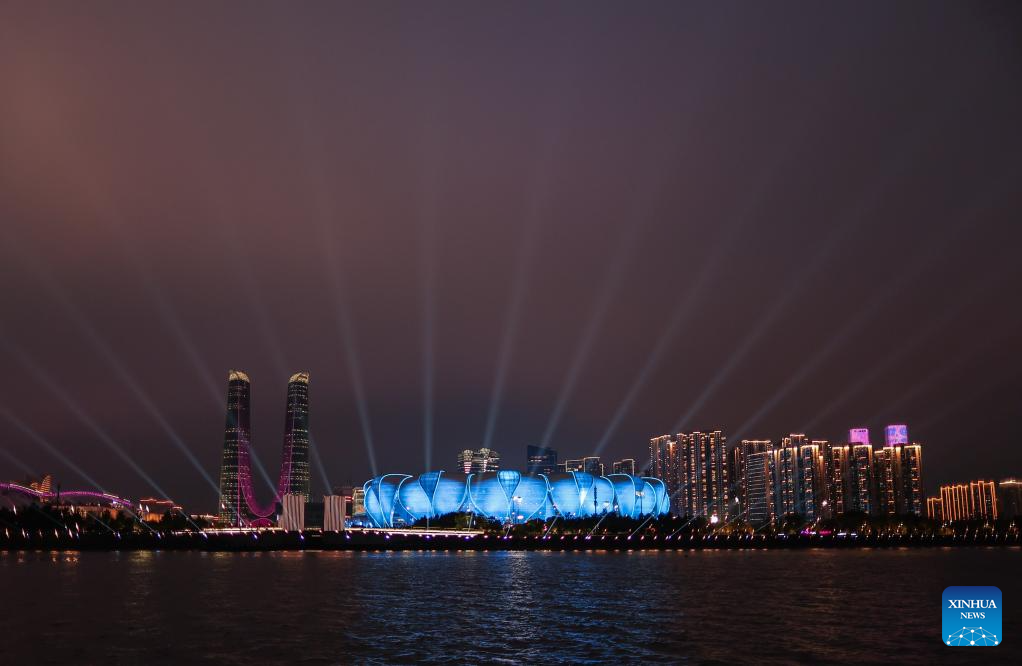 Hangzhou Olympic Sports Center Stadium is lighted before the opening ceremony of the 19th Asian Games in Hangzhou, east China's Zhejiang Province, Sept. 23, 2023. (Xinhua/Wu Zhuang)
