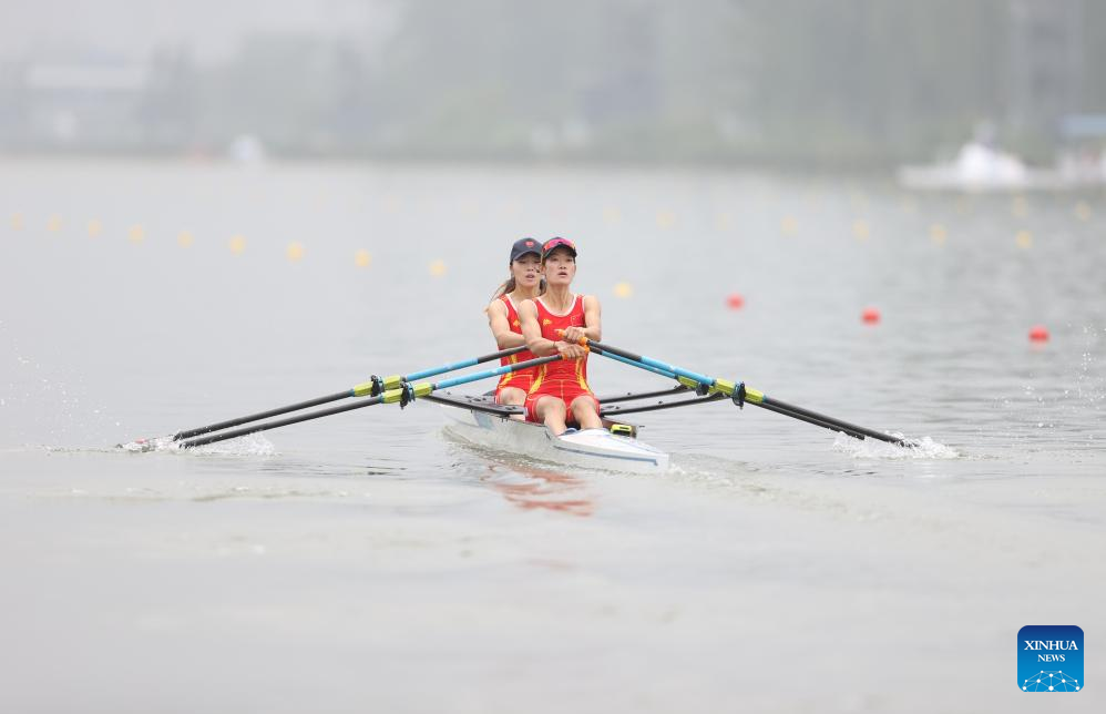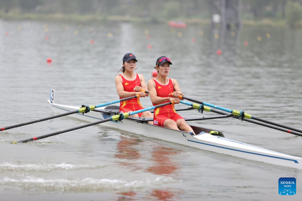 Zou Jiaqi (L) and Qiu Xiuping of China compete during the Women's Lightweight Double Sculls final of rowing at the 19th Asian Games in Hangzhou, east China's Zhejiang Province, Sept. 24, 2023. (Xinhua/Jia Haocheng)