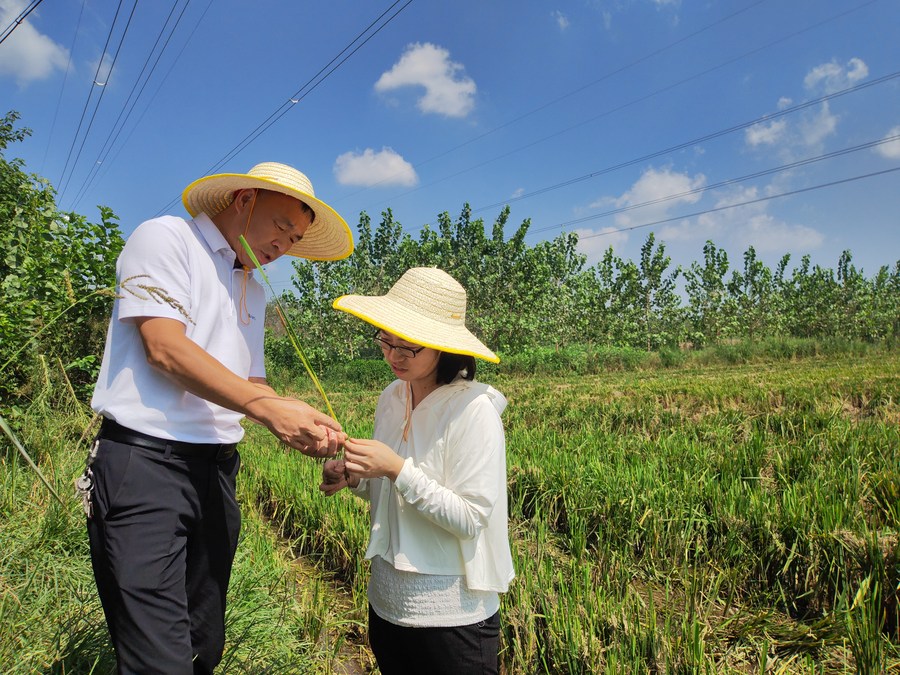 Wang Weibin (L), the founder of the Xiantao ratoon rice sci-tech station, and Du Chanchan, a PhD candidate at Huazhong Agricultural University, check the growth of ratoon rice in Xiantao City, central China's Hubei Province, Aug. 23, 2023. (Xinhua/Yue Wenwan)