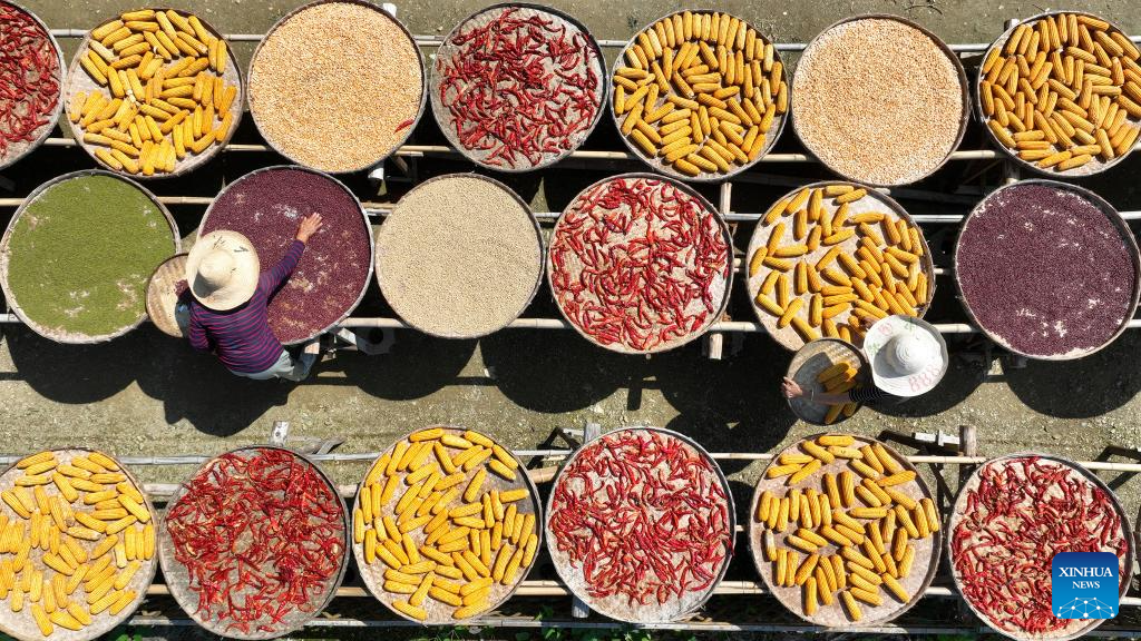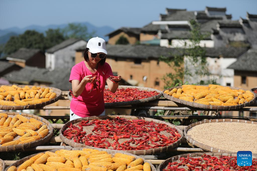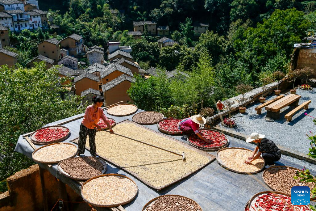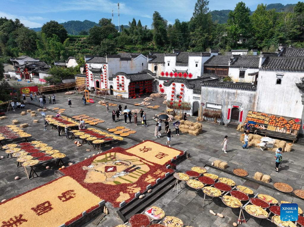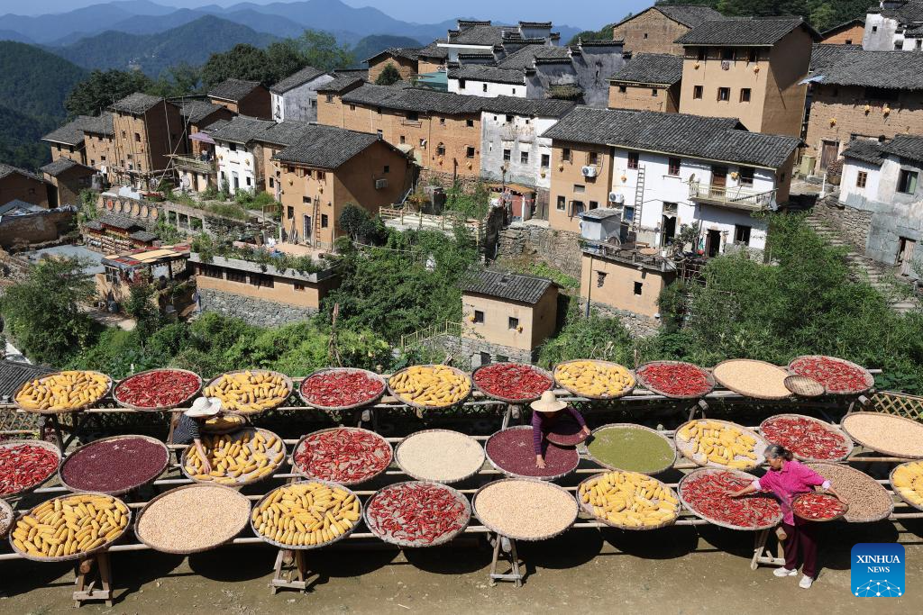 Villagers dry crops on a drying yard at Yangchan Village in Huangshan City, east China's Anhui Province, Sept. 18, 2023. "Shaiqiu," or drying crops in autumn, is a rural tradition in China. Crops of different colors are placed to form various patterns which become attractions for tourists. (Photo by Shi Yalei/Xinhua)