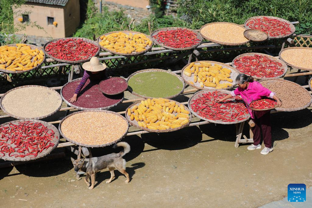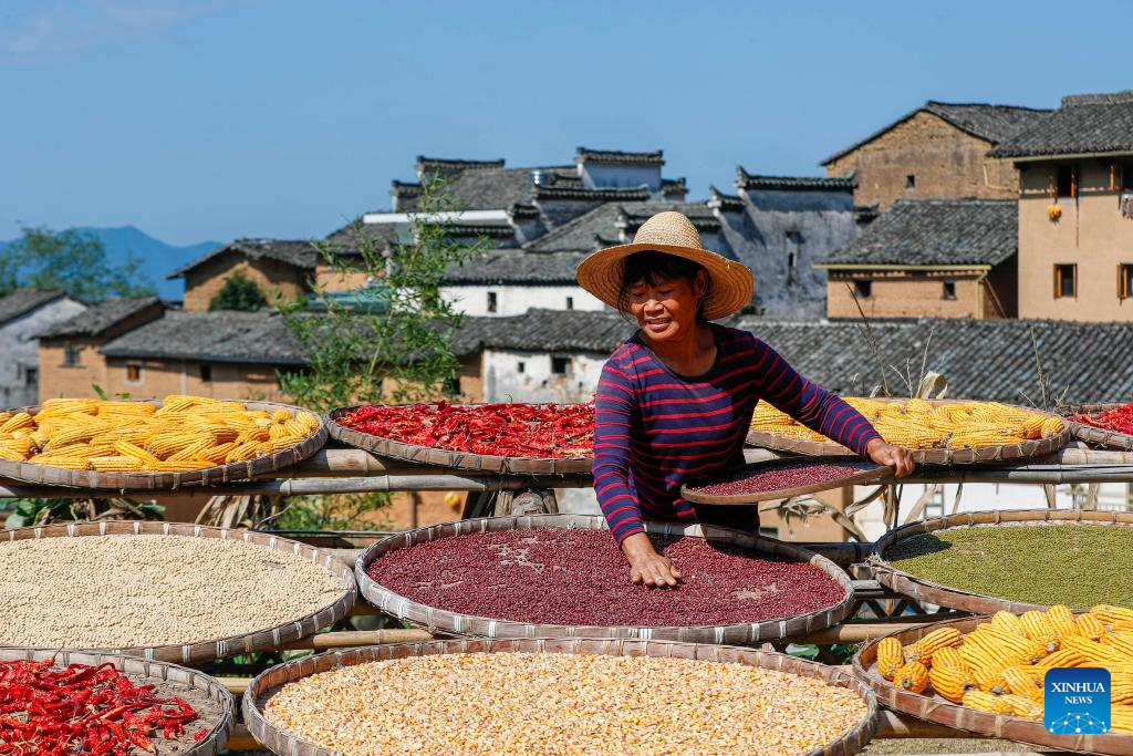 A villager dries crops on a drying yard at Yangchan Village in Huangshan City, east China's Anhui Province, Sept. 18, 2023. "Shaiqiu," or drying crops in autumn, is a rural tradition in China. Crops of different colors are placed to form various patterns which become attractions for tourists. (Photo by Shi Yalei/Xinhua)