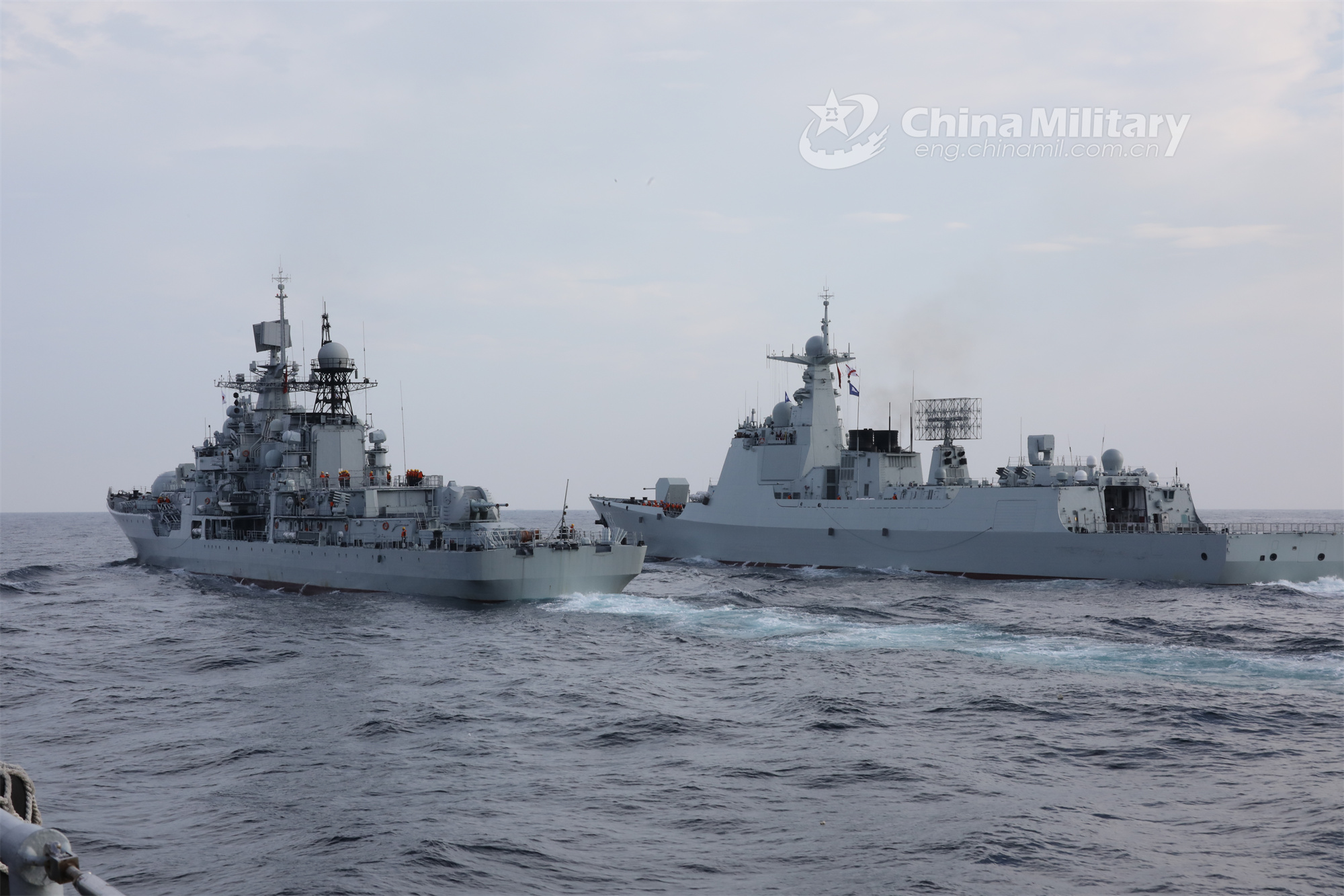 Two vessels attached to a destroyer flotilla with the navy under the PLA Eastern Theater Command steam in alongside formation in an undisclosed sea area during a maritime training exercise on August 16,2023. (eng.chinamil.com.cn/Photo by Wen Zidong)