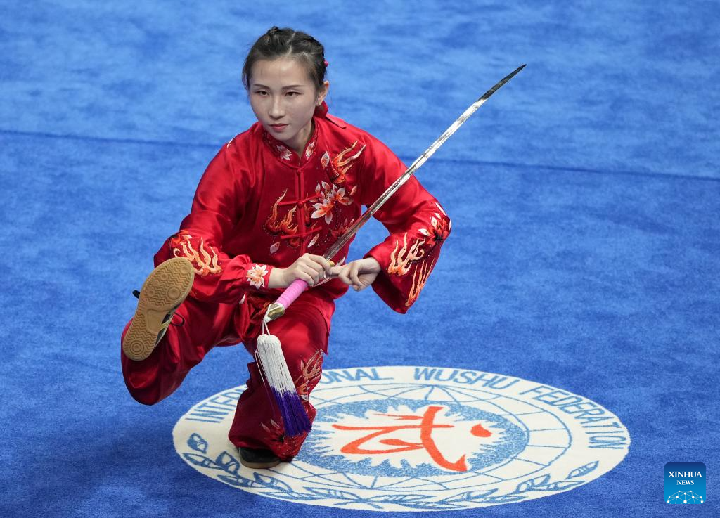 Tong Xin of China competes during Women's Taijijian Final of Wushu at the 19th Asian Games in Hangzhou, east China's Zhejiang Province, Sept. 24, 2023. Women's Taijiquan & Taijijian All-round of Wushu took place here Sunday. (Xinhua/Song Yanhua)