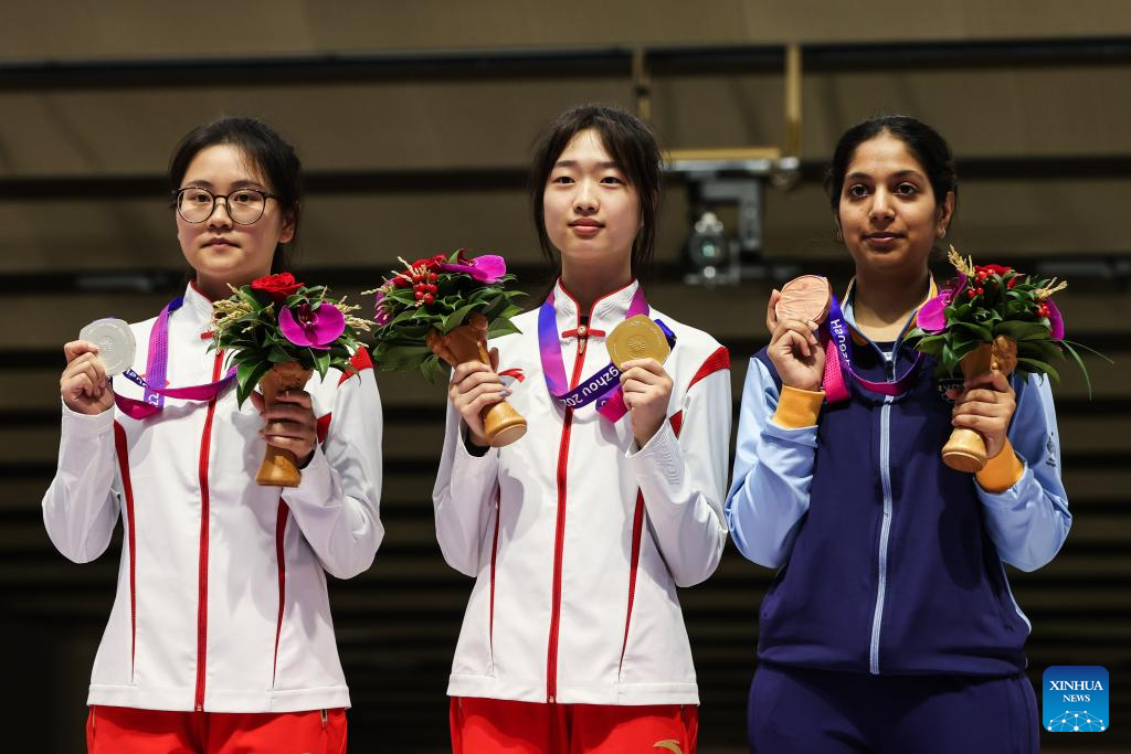 Han Jiayu (L), Huang Yuting (C) of China and Ramita of India pose for photos during the awarding ceremony for the Shooting 10m Air Rifle Women's Final at the 19th Asian Games in Hangzhou, east China's Zhejiang Province, Sept. 24, 2023. (Xinhua/Shan Yuqi)