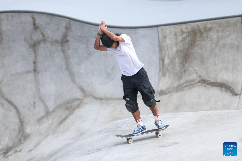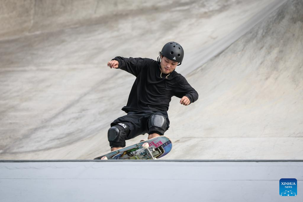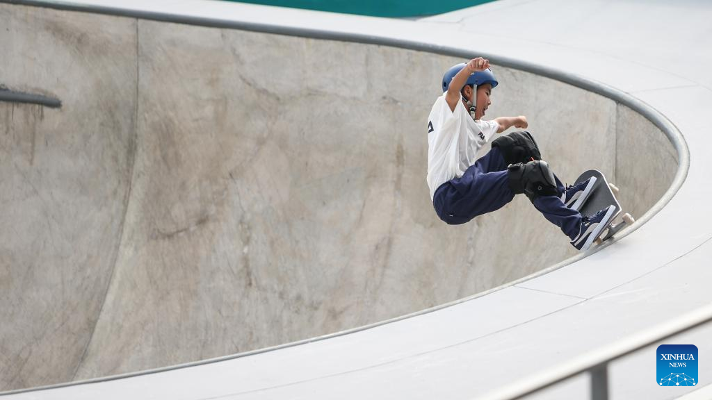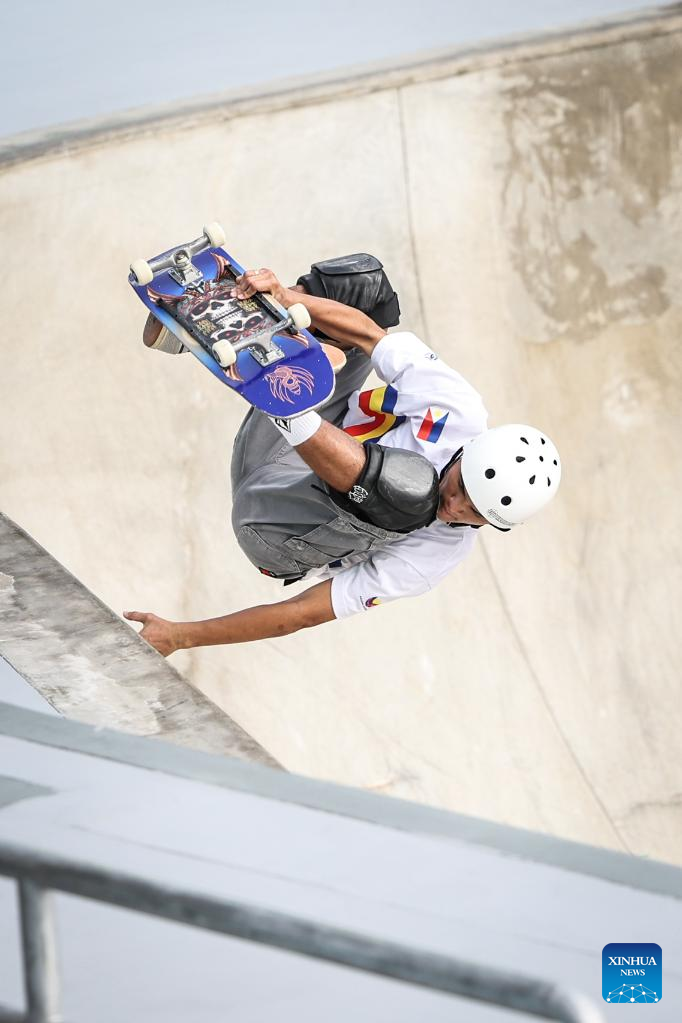 Jericho Jojit Francisco Jr of Philippines competes during Men's Park Qualification Heat of Skateboarding at the 19th Asian Games in Hangzhou, east China's Zhejiang Province, Sept. 24, 2023. (Xinhua/Pan Yulong)