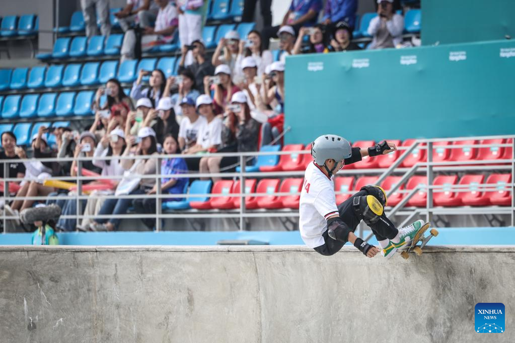 Moon Gangho of South Korea competes during Men's Park Qualification Heat of Skateboarding at the 19th Asian Games in Hangzhou, east China's Zhejiang Province, Sept. 24, 2023. (Xinhua/Pan Yulong)