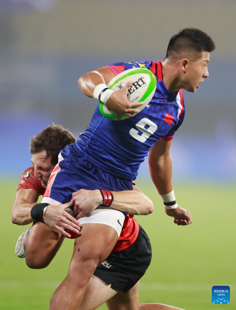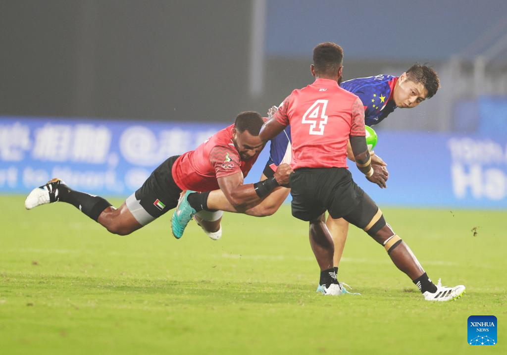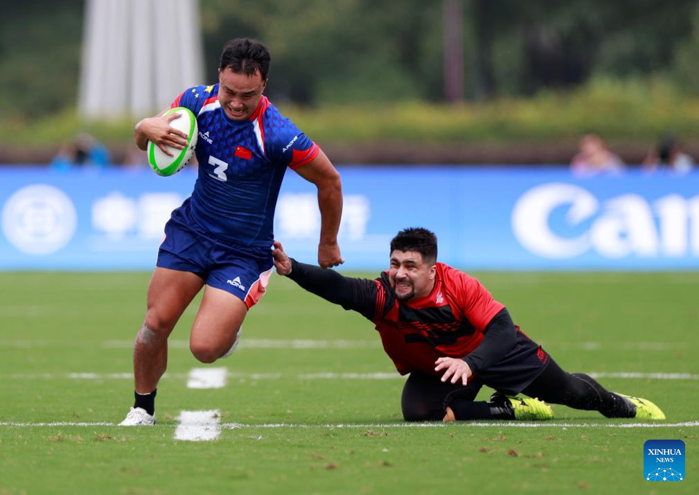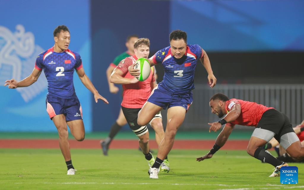 Zheng Zhiyuan (1st R) of China competes during the Men's Pool match of Rugby Sevens between China and United Arab Emirates at the 19th Asian Games in Hangzhou, east China's Zhejiang Province, Sept. 24, 2023. (Xinhua/Ren Zhenglai)