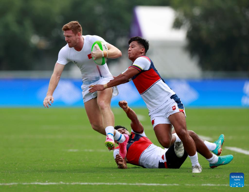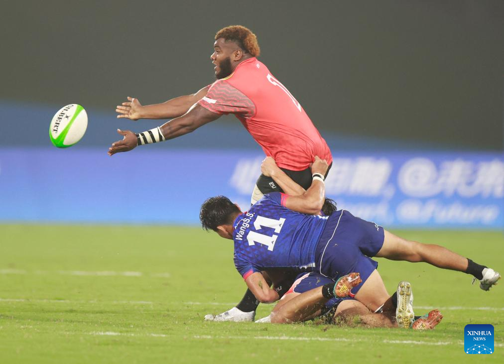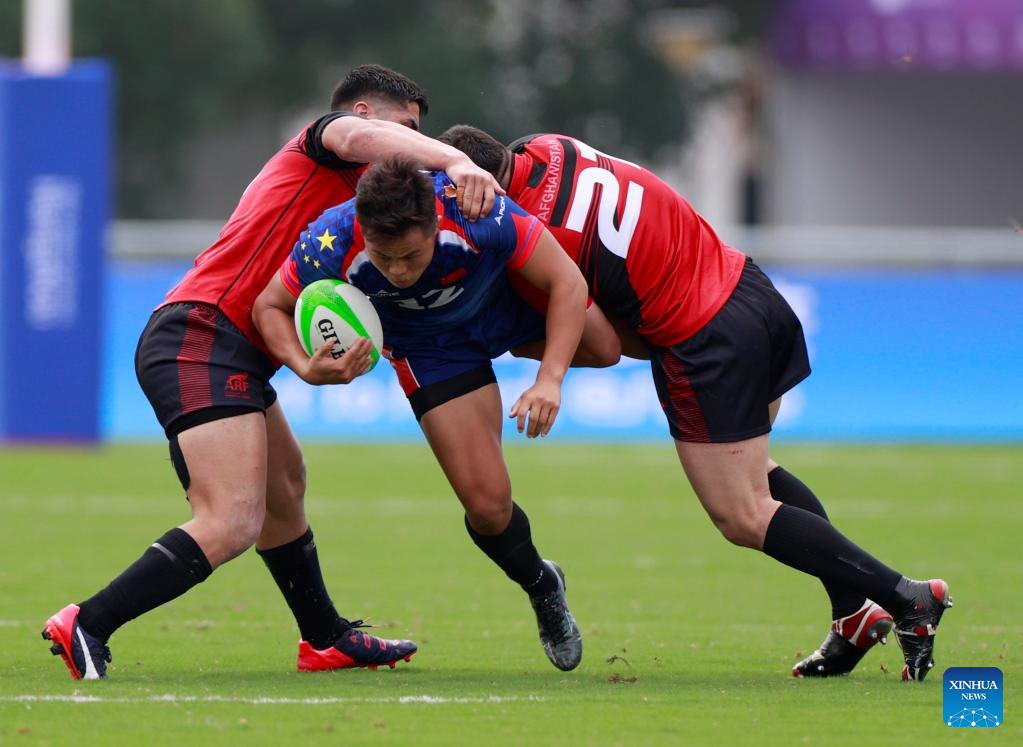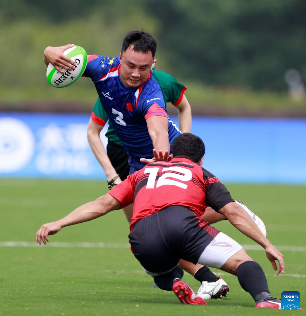 Zheng Zhiyuan (1st R) of China competes during the Men's Pool match of Rugby Sevens between China and United Arab Emirates at the 19th Asian Games in Hangzhou, east China's Zhejiang Province, Sept. 24, 2023. (Xinhua/Ren Zhenglai)
