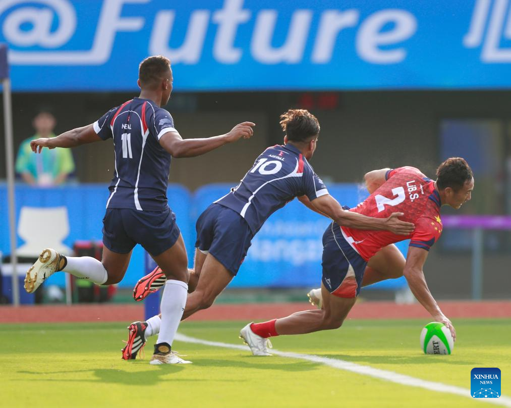 Li Benshou (R) of China competes during the Men's Pool D match of Rugby Sevens beween China and Nepal at the 19th Asian Games in Hangzhou, east China's Zhejiang Province, Sept. 24, 2023. (Xinhua/Ren Zhenglai)