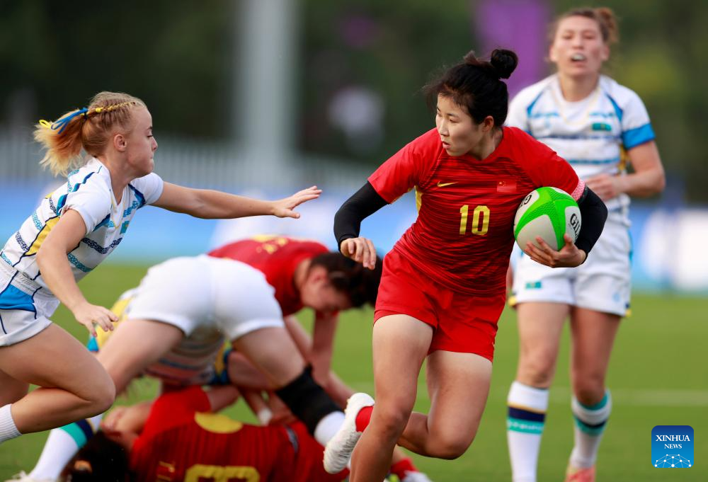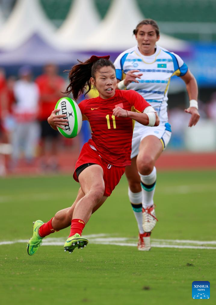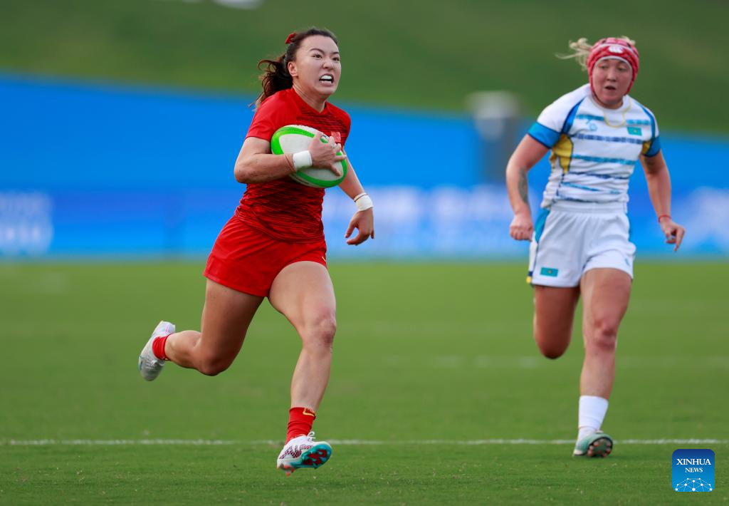 Liao Jiuli (R, front) of China competes during the Women's Pool E match of Rugby Sevens between China and Kazakhstan at the 19th Asian Games in Hangzhou, east China's Zhejiang Province, Sept. 24, 2023. (Xinhua/Ren Zhenglai)