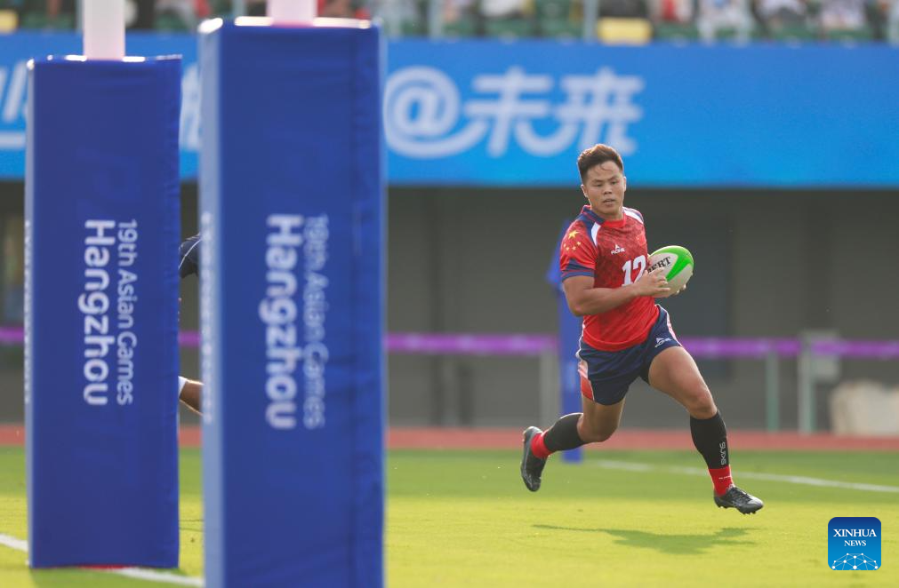 Wu Jiajun of China competes during the Men's Pool match of Rugby Sevens between China and United Arab Emirates at the 19th Asian Games in Hangzhou, east China's Zhejiang Province, Sept. 24, 2023. (Xinhua/Ren Zhenglai)