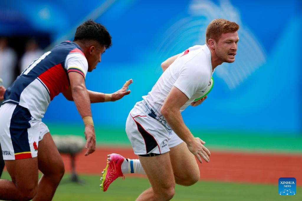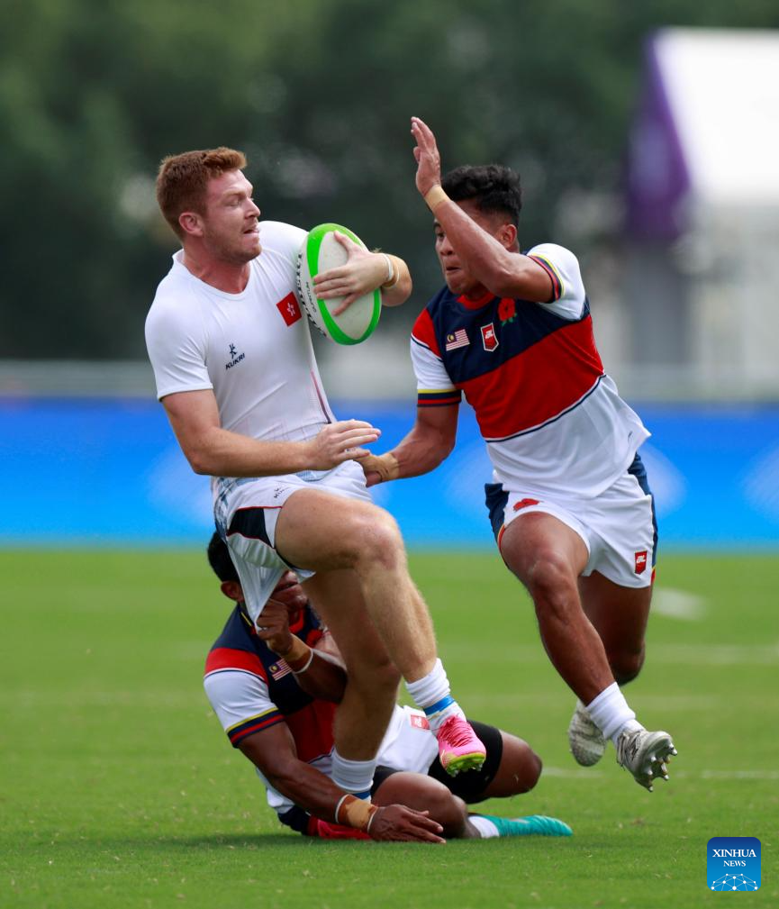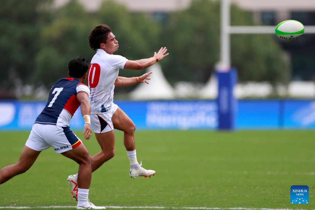 Liam Thomas Herbert (3rd R) of China's Hong Kong competes during the Men's Pool A match of Rugby Sevens beween China's Hong Kong and Malaysia at the 19th Asian Games in Hangzhou, east China's Zhejiang Province, Sept. 24, 2023. (Xinhua/Ren Zhenglai)