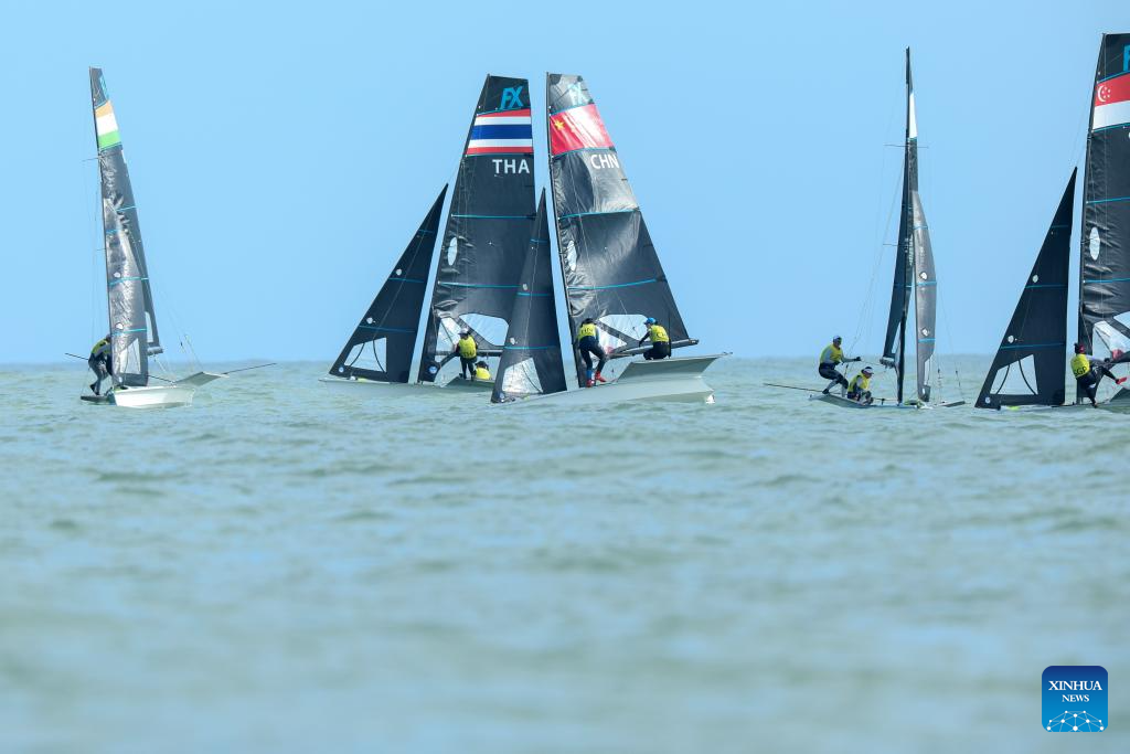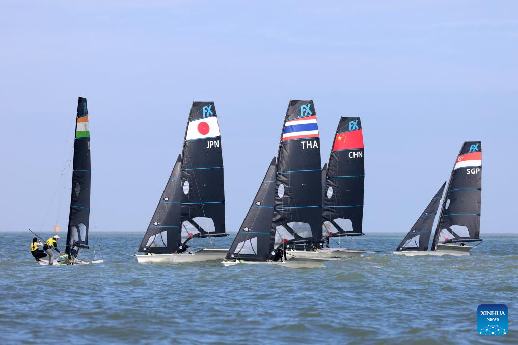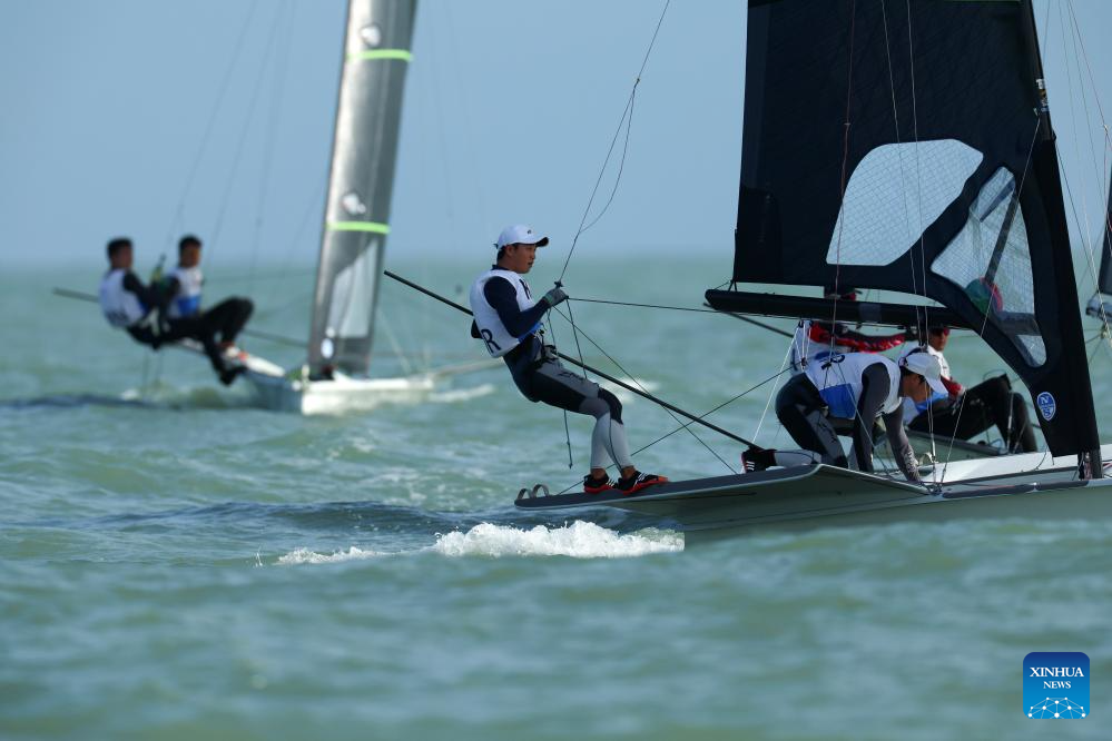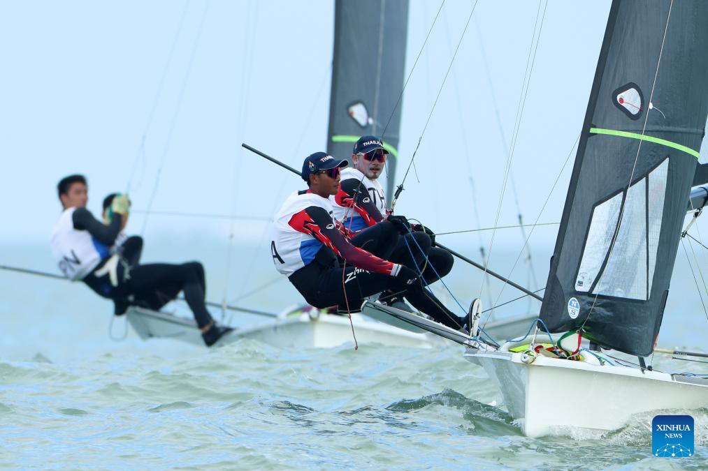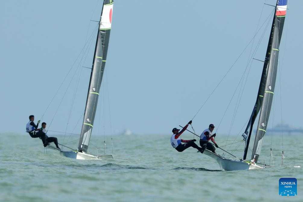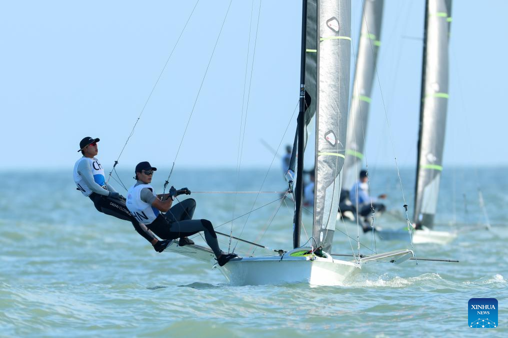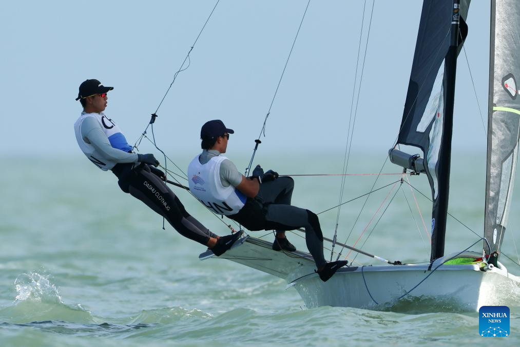 Suthon Yampinid/Kan Kachachuen of Thailand (R) compete during the Men's Skiff 49er Race of Sailing at the 19th Asian Games in Ningbo, east China's Zhejiang Province, Sept. 24, 2023. (Xinhua/Zhang Tao)