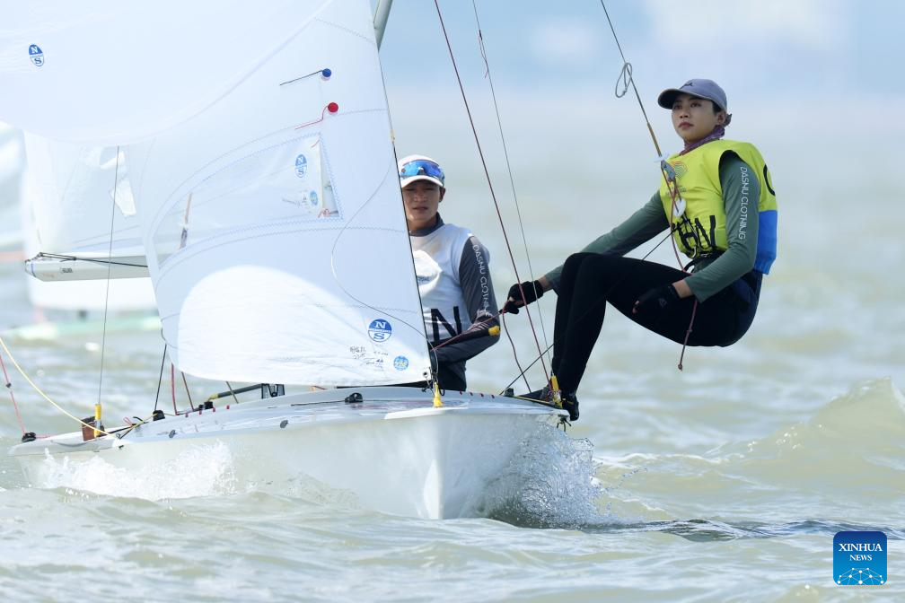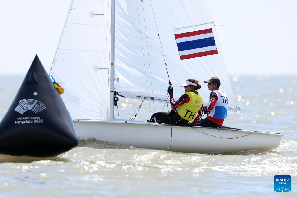 Navee Thamsoontorn (R)/Piyaporn Khemkaew of Thailand compete during the Mixed Dinghy 470 Race of sailing at the 19th Asian Games in Ningbo, east China's Zhejiang Province, Sept. 24, 2023. (Xinhua/Zhang Tao)