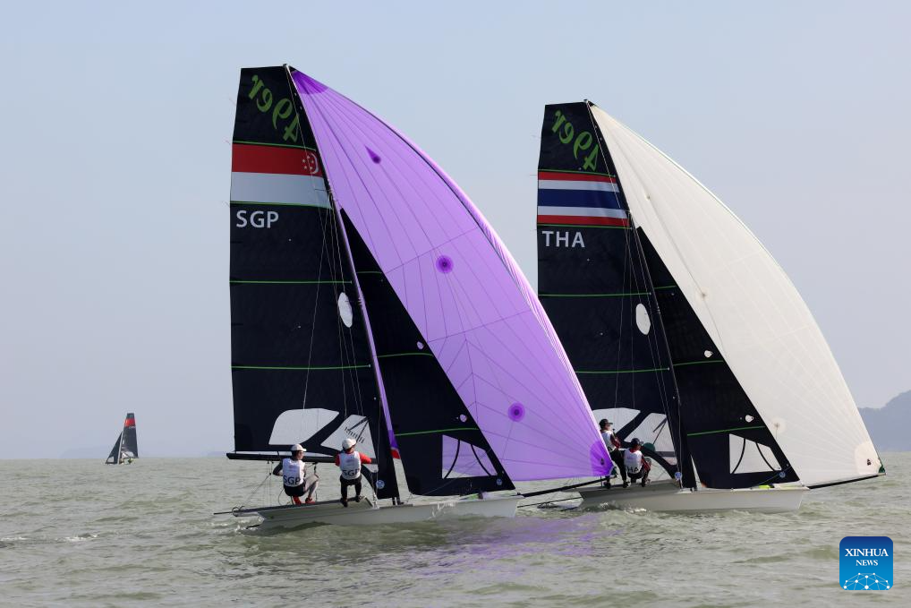 Koh Yi Nian/Tan Jen-E (L) of Singapore and Suthon Yampinid/Kan Kachachuen of Thailand compete during the Men's Skiff 49er Race of sailing at the 19th Asian Games in Ningbo, east China's Zhejiang Province, Sept. 24, 2023. (Xinhua/Zhang Tao)
