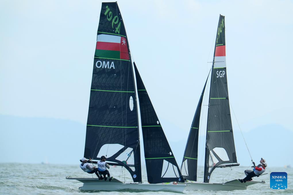 Musab Mohammed Sulaiyam Al Hadi/Waleed Issa Al-Habashi Al-Kendi (L) of Oman and Kon Yi Nian/Tan Jen-E of Singapore compete during the Men's Skiff 49er Race of Sailing at the 19th Asian Games in Ningbo, east China's Zhejiang Province, Sept. 24, 2023. (Xinhua/Zhang Tao)