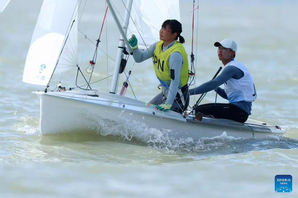 Okada Keiju (R)/Yoshioka Miho of Japan compete during the Mixed Dinghy 470 Race of sailing at the 19th Asian Games in Ningbo, east China's Zhejiang Province, Sept. 24, 2023. (Xinhua/Zhang Tao)