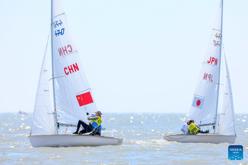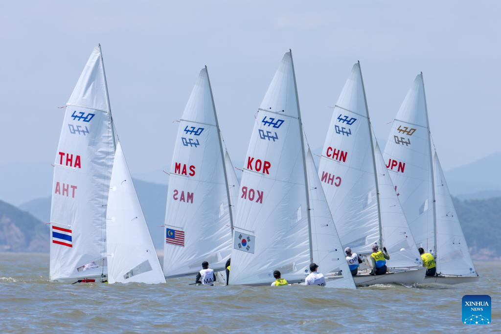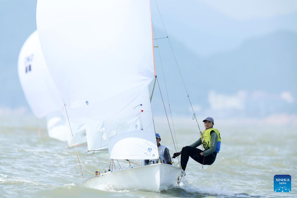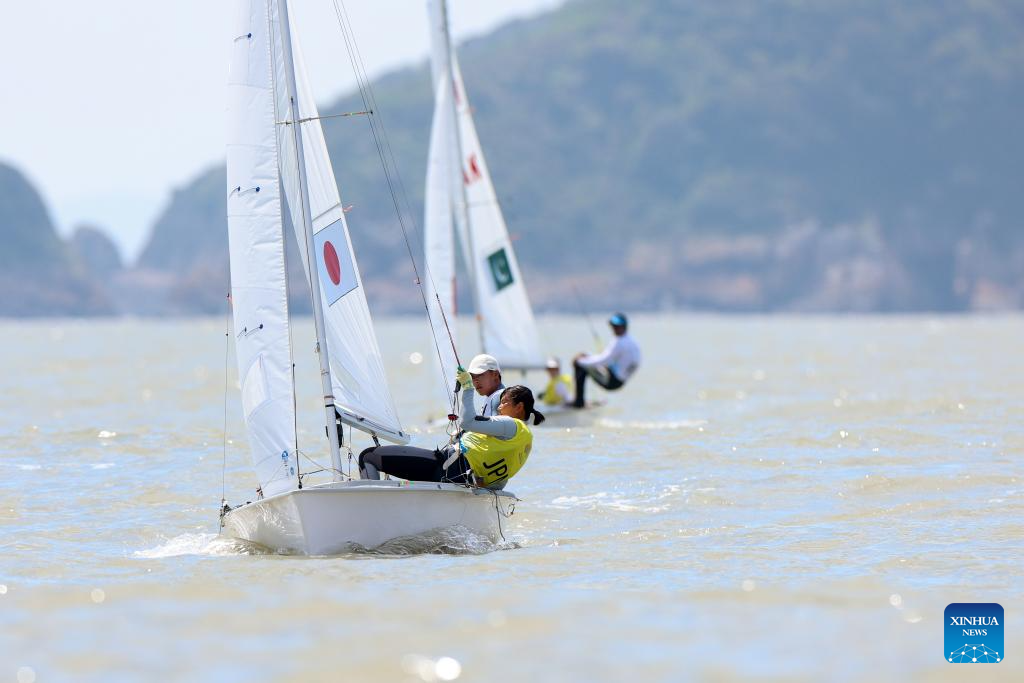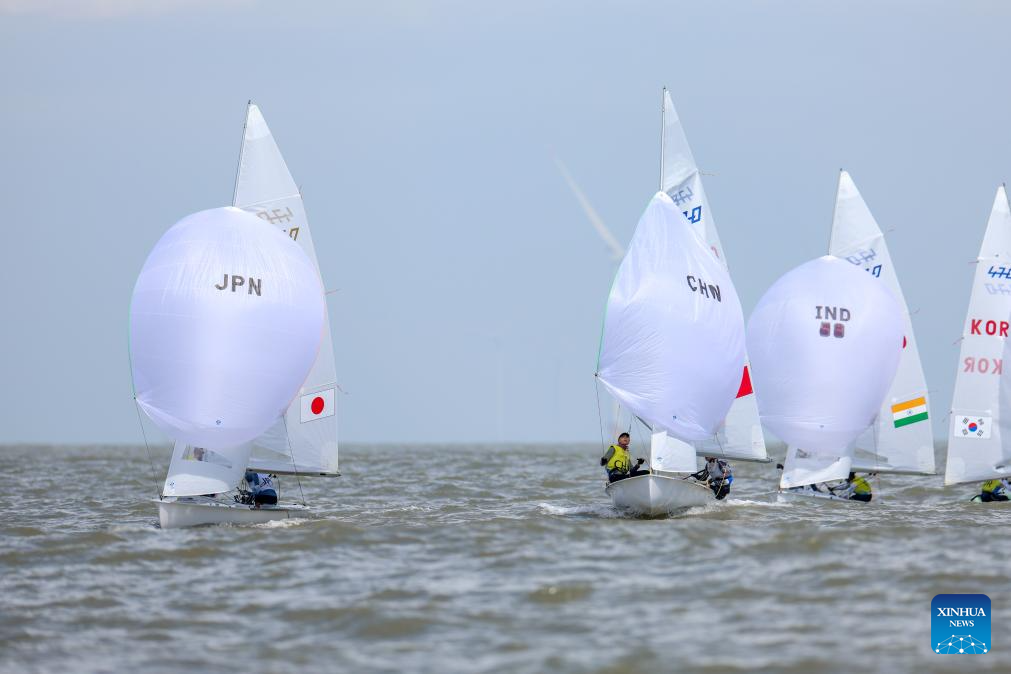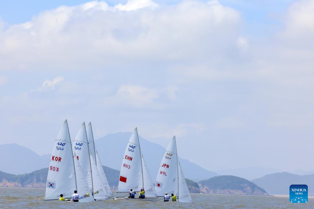 Sailors compete during the Mixed Dinghy 470 Race of sailing at the 19th Asian Games in Ningbo, east China's Zhejiang Province, Sept. 24, 2023. (Xinhua/Zhang Tao)