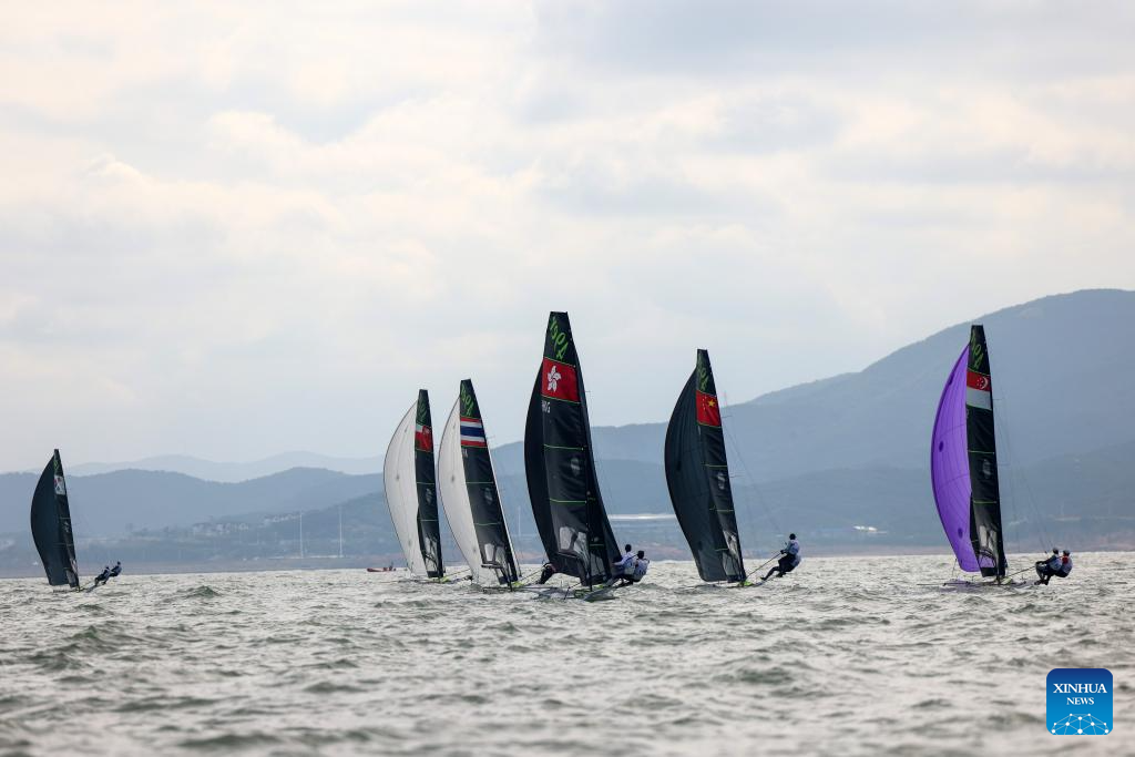 Sailors compete during the Men's Skiff 49er Race of sailing at the 19th Asian Games in Ningbo, east China's Zhejiang Province, Sept. 24, 2023. (Xinhua/Zhang Tao)