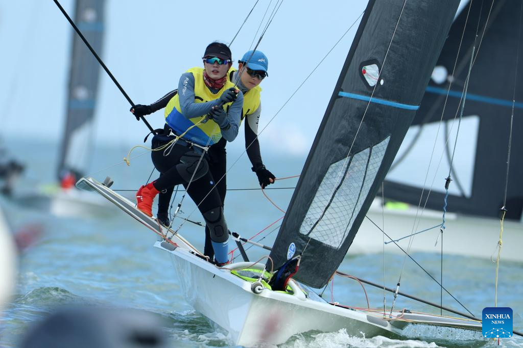 Hu Xiaoyu/Shan Mengyuan of China compete during the Women's Skiff 49erFX Race of sailing at the 19th Asian Games in Ningbo, east China's Zhejiang Province, Sept. 24, 2023. (Xinhua/Zhang Tao)