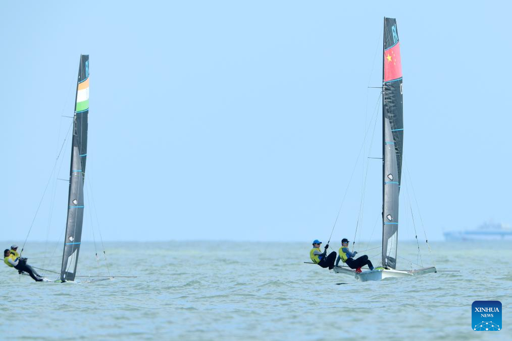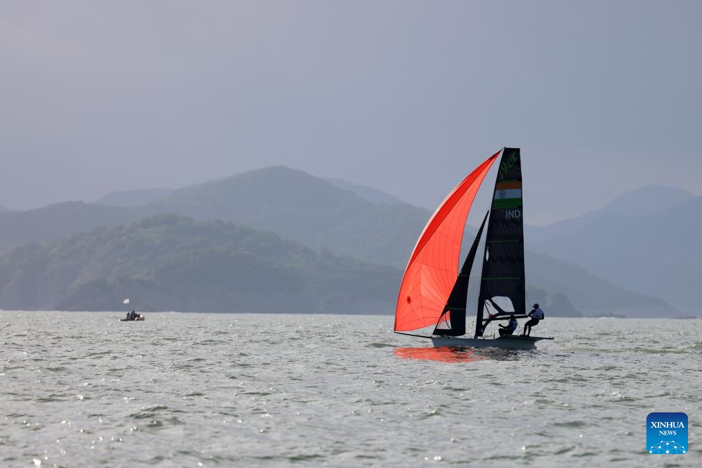 Ganapathy Kelapanda Chengappa/Varun Ashok Thakkar of India compete during the Men's Skiff 49er Race of sailing at the 19th Asian Games in Ningbo, east China's Zhejiang Province, Sept. 24, 2023. (Xinhua/Zhang Tao)