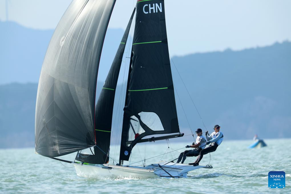 Liu Tian/Wen Zaiding of China compete during the Men's Skiff 49er Race of sailing at the 19th Asian Games in Ningbo, east China's Zhejiang Province, Sept. 24, 2023. (Xinhua/Zhang Tao)