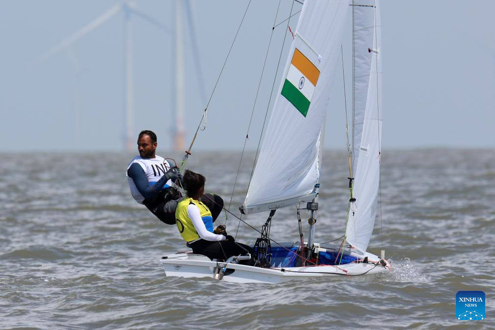Preethi Kongara/Shekhar Sudhanshu (L) of India compete during the Mixed Dinghy 470 Race of sailing at the 19th Asian Games in Ningbo, east China's Zhejiang Province, Sept. 24, 2023. (Xinhua/Zhang Tao)