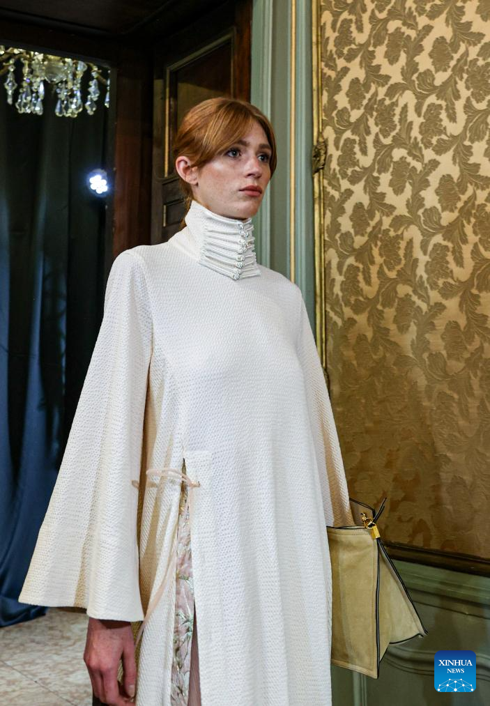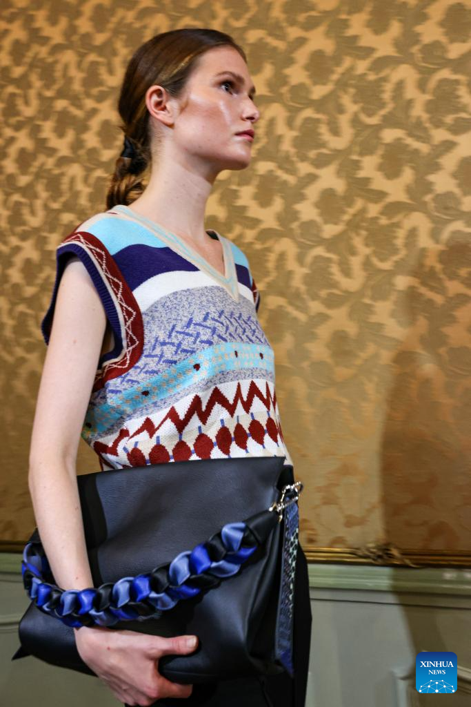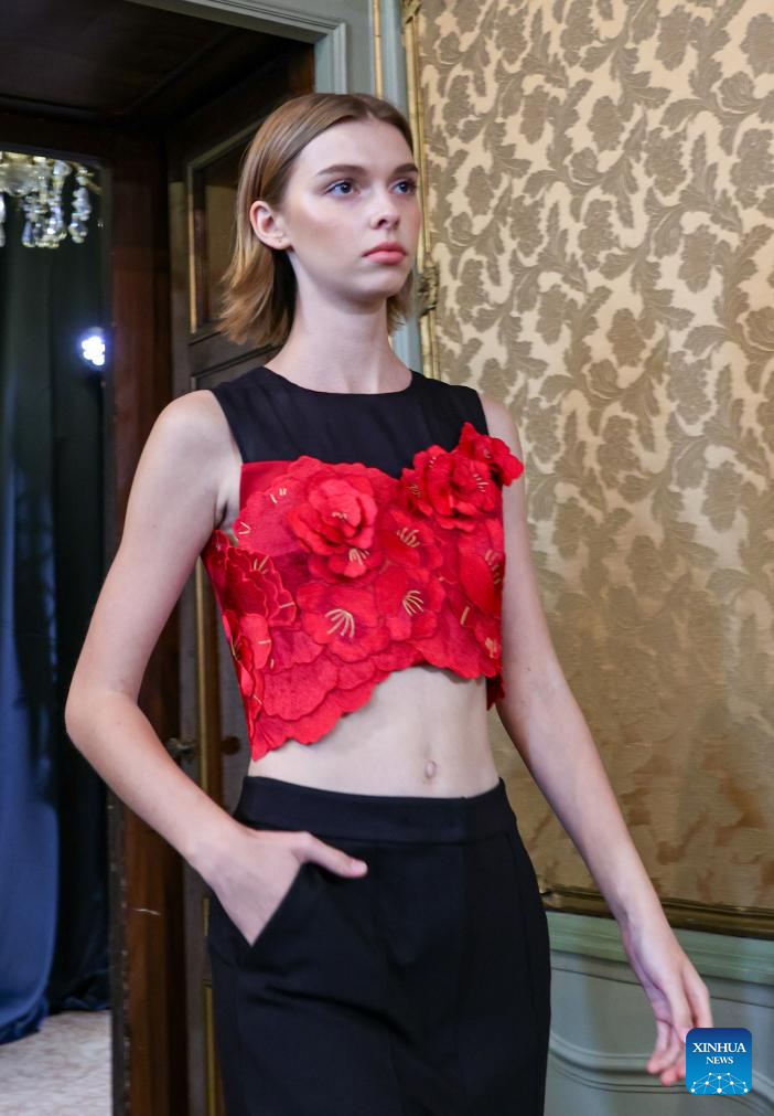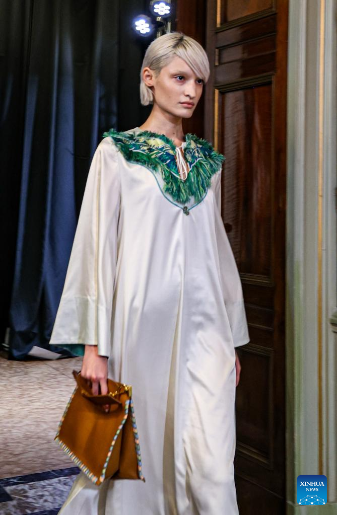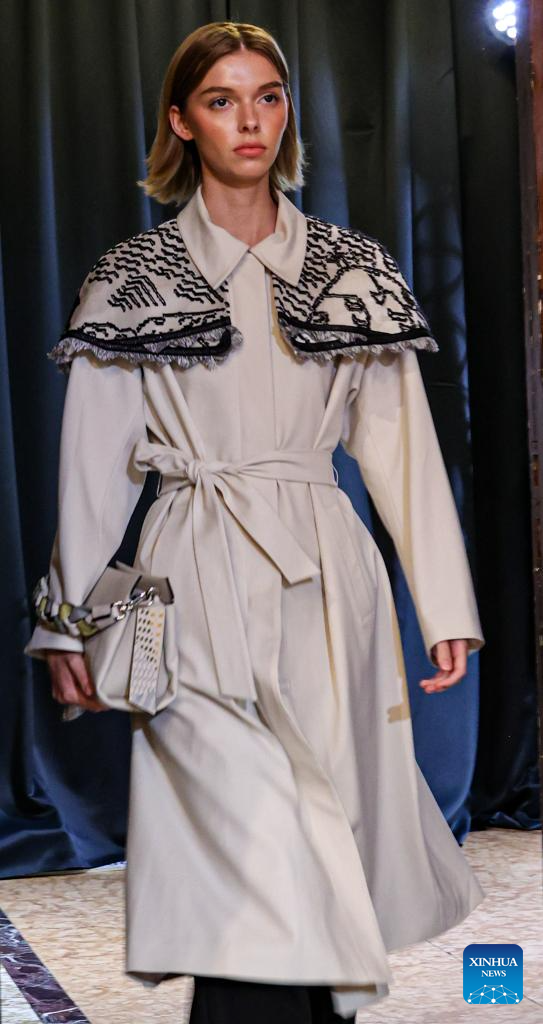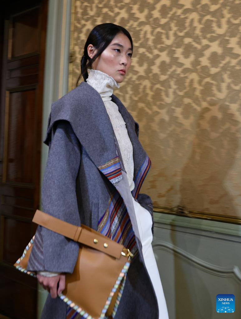 A model presents a creation featuring embroidery of Yi ethnic group from Chuxiong Yi Autonomous Prefecture of southwest China's Yunnan Province during Milan Fashion Week in Milan, Italy, on Sept. 23, 2023. (Xinhua/Liu Yongqiu)