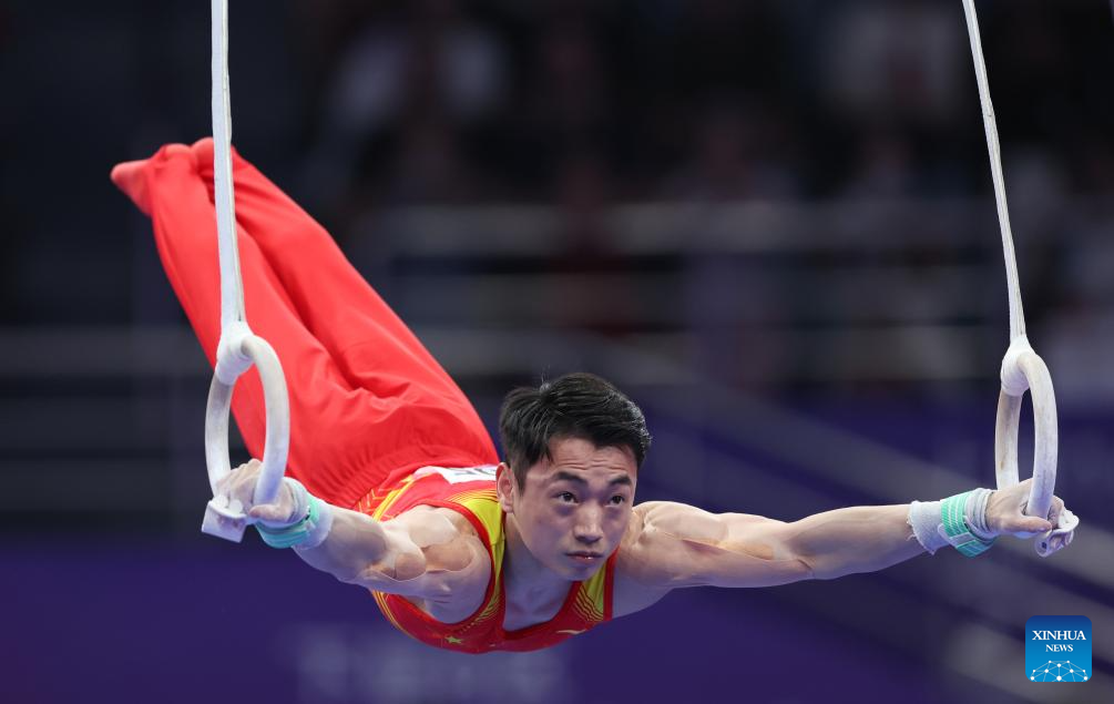 Zou Jingyuan of China competes on the rings of artistic gymnastics at the 19th Asian Games in Hangzhou, east China's Zhejiang Province, Sept. 24, 2023. (Xinhua/Cheng Tingting)
