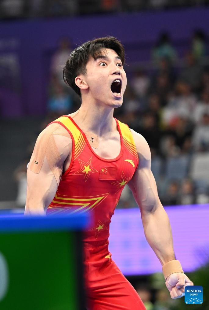 Lin Chaopan of China reacts after the pommel horse of artistic gymnastics at the 19th Asian Games in Hangzhou, east China's Zhejiang Province, Sept. 24, 2023. (Xinhua/Cheng Min)