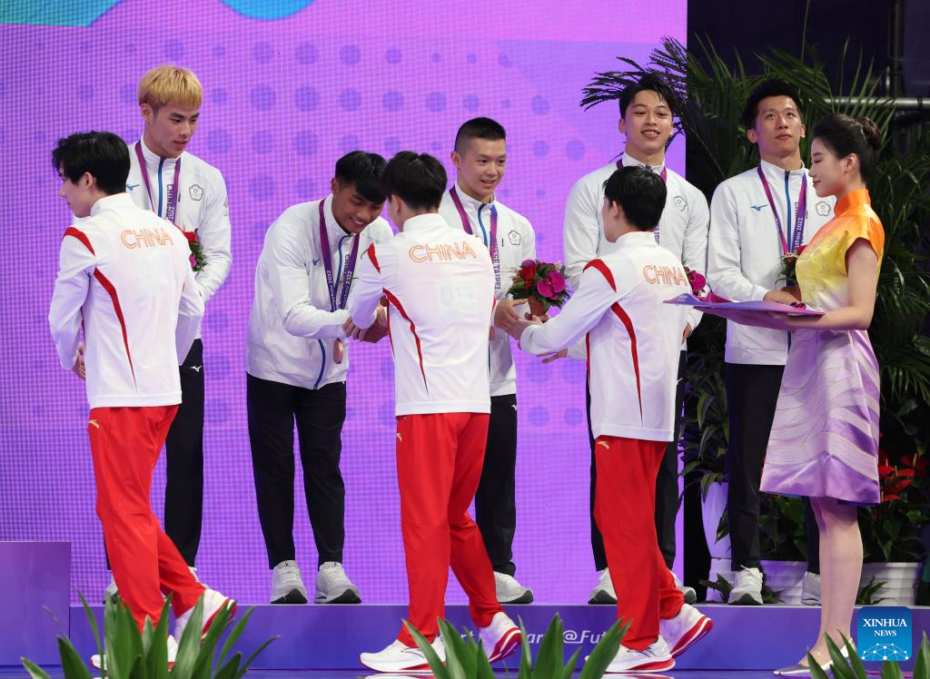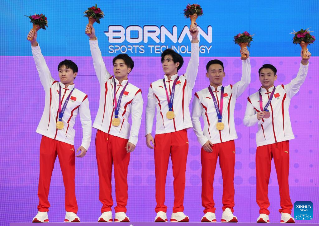 Players of China attend the awarding ceremony after men's team finals of artistic gymnastics at the 19th Asian Games in Hangzhou, east China's Zhejiang Province, Sept. 24, 2023. (Xinhua/Cheng Tingting)