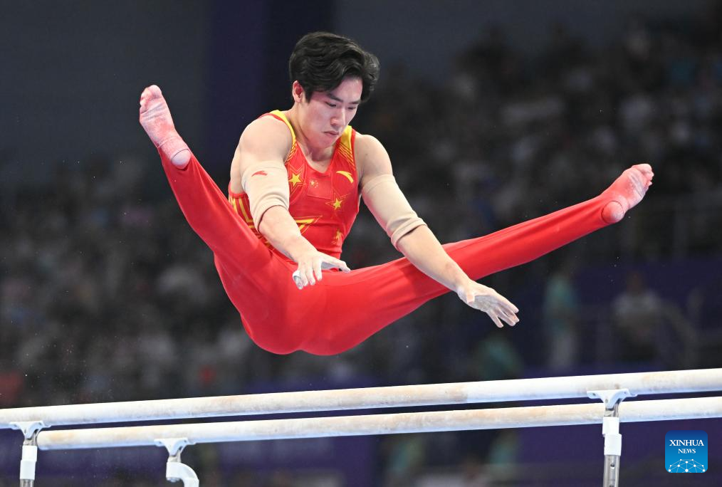 Zhang Boheng of China competes on the parallel bars of artistic gymnastics at the 19th Asian Games in Hangzhou, east China's Zhejiang Province, Sept. 24, 2023. (Xinhua/Cheng Min)