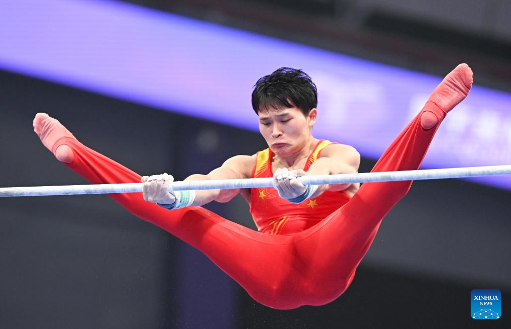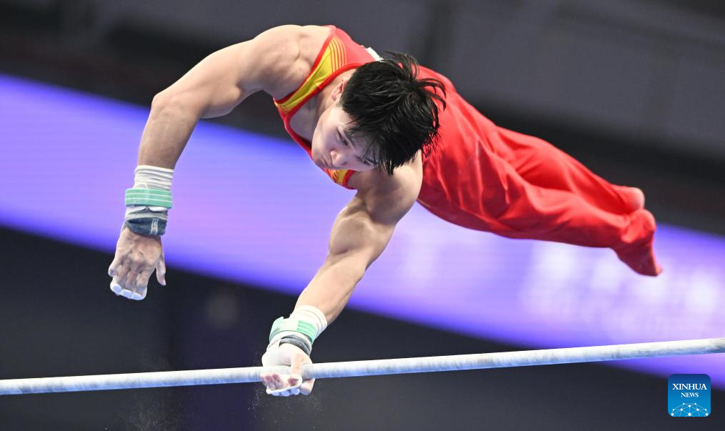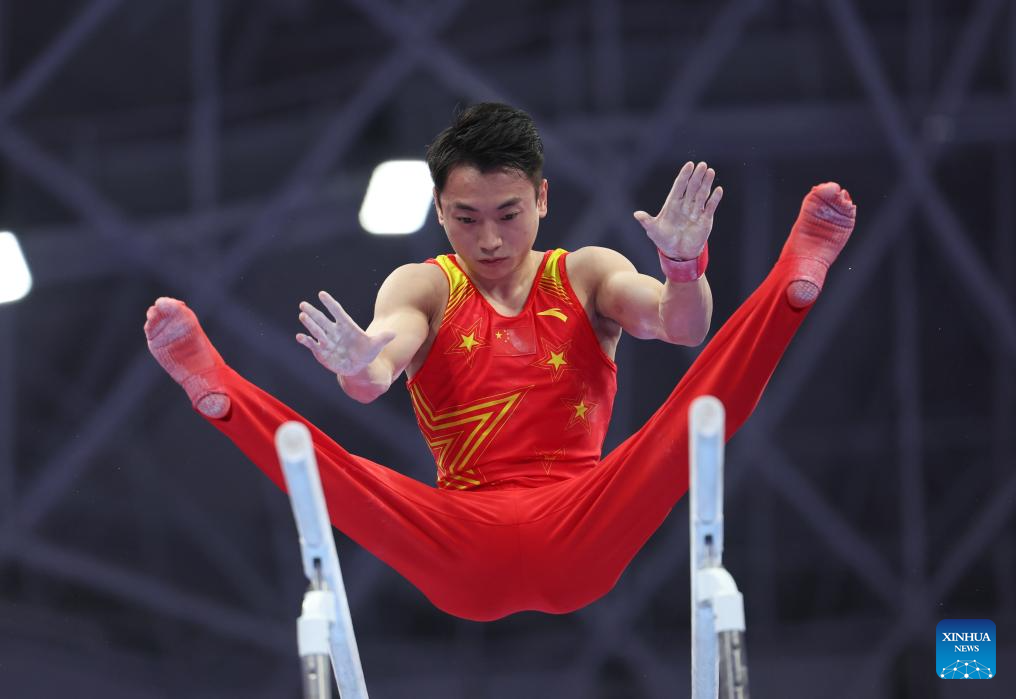 Zou Jingyuan of China competes on the parallel bars of artistic gymnastics at the 19th Asian Games in Hangzhou, east China's Zhejiang Province, Sept. 24, 2023. (Xinhua/Cheng Tingting)