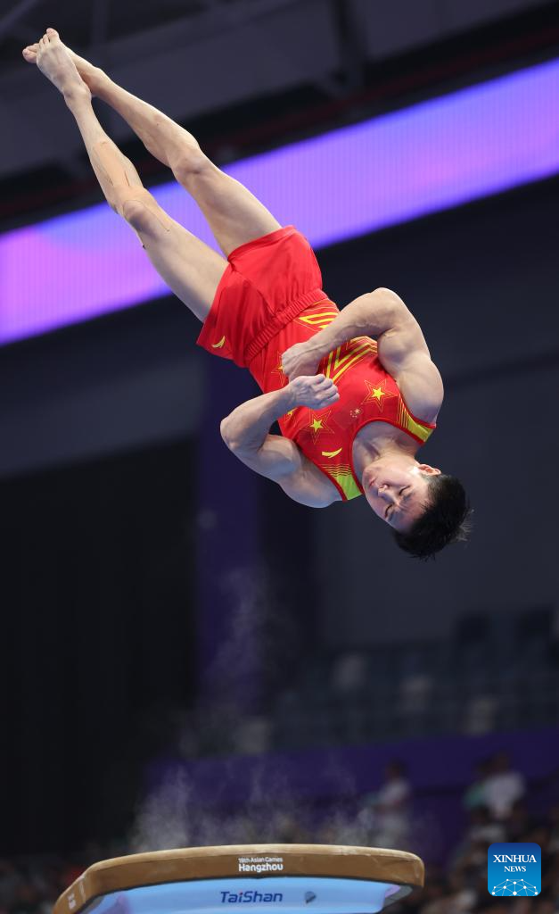 Lan Xingyu of China competes on the vault of artistic gymnastics at the 19th Asian Games in Hangzhou, east China's Zhejiang Province, Sept. 24, 2023. (Xinhua/Cheng Tingting)