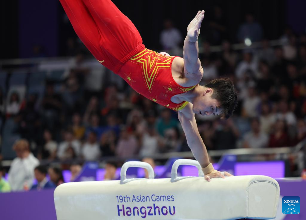 Lin Chaopan of China competes on the pommel horse of artistic gymnastics at the 19th Asian Games in Hangzhou, east China's Zhejiang Province, Sept. 24, 2023. (Xinhua/Cheng Tingting)