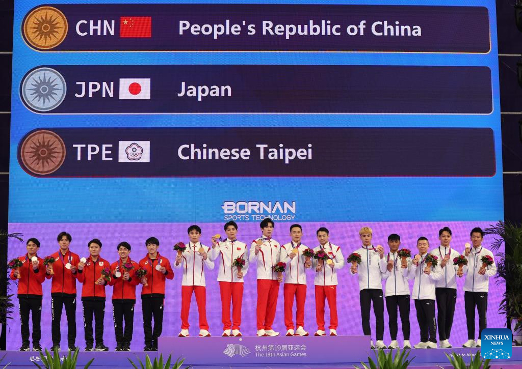 HANGZHOU, Sept. 24 (Xinhua) -- China clinched the men's gymnastics team gold medal with 262.025 points at the 19th Asian Games here on Sunday, beating Japan and Chinese Taipei to second and third places respectively.
