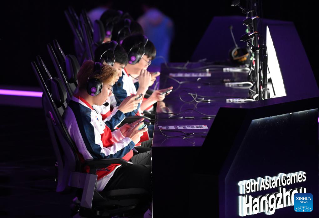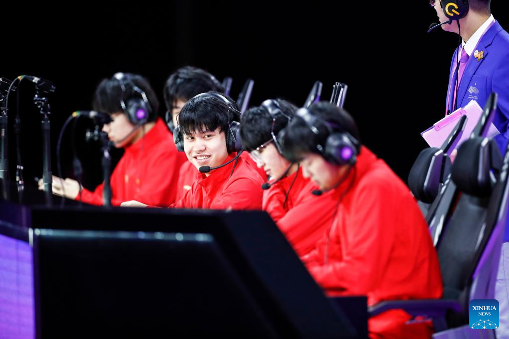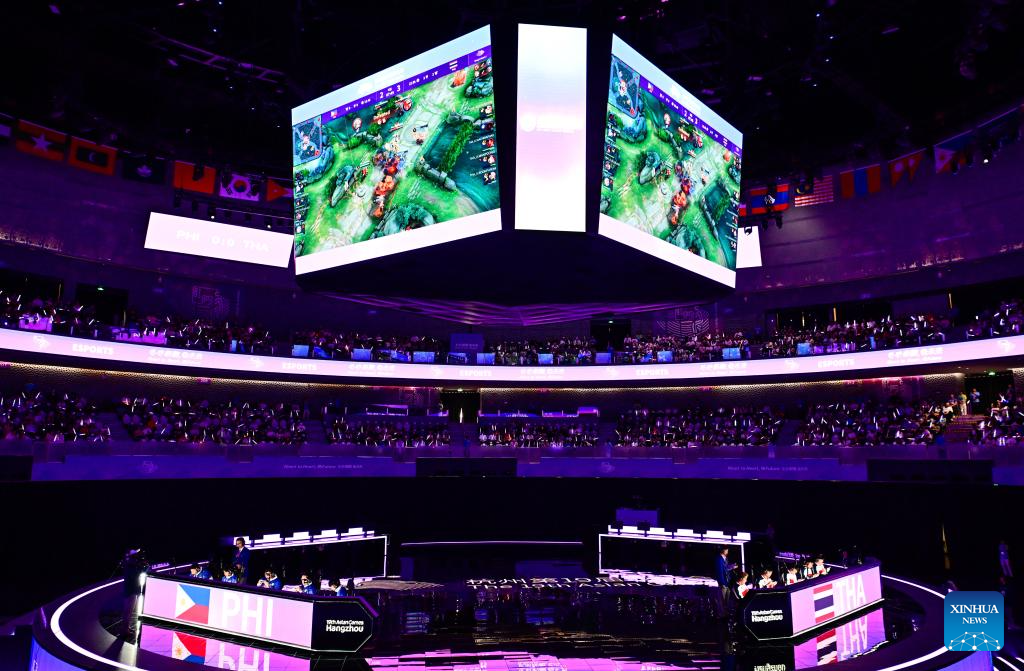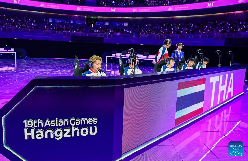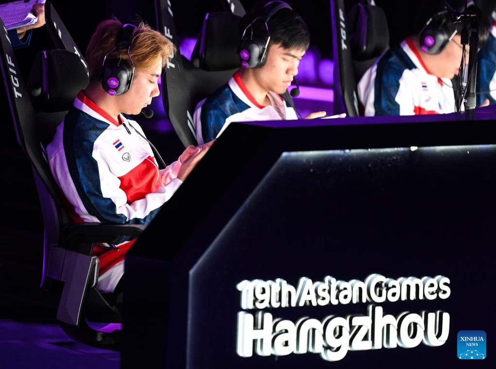 Team Thailand (R) compete with team Philippines during the Arena of Valor Asian Games Version Group D match of Esports at the 19th Asian Games in Hangzhou, east China's Zhejiang Province, Sept. 24, 2023. (Xinhua/Yan Linyun)
