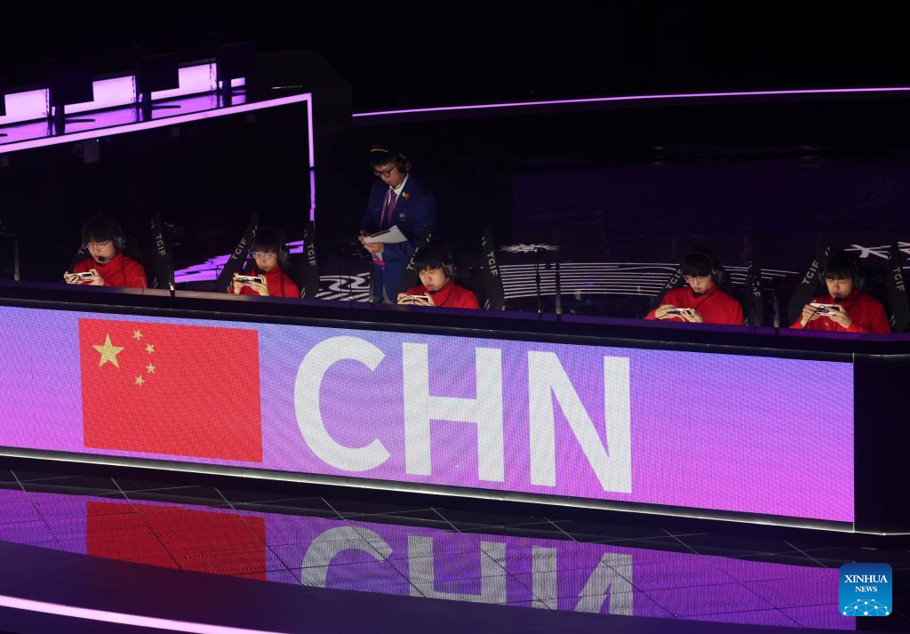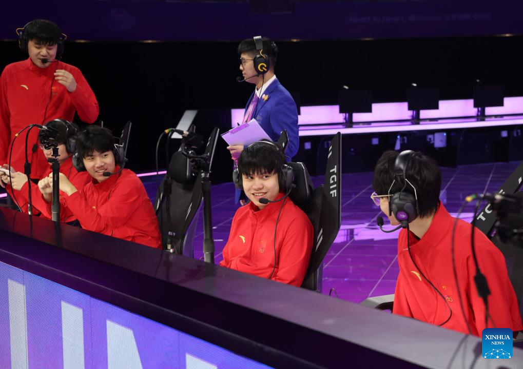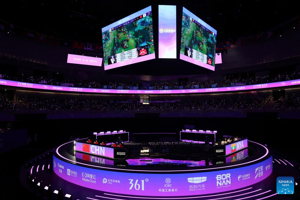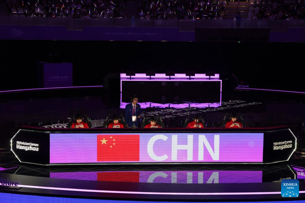 Players of team China compete during the Arena of Valor Asian Games Version Quarterfinal match of Esports at the 19th Asian Games in Hangzhou, east China's Zhejiang Province, Sept. 24, 2023. (Xinhua/Hu Xingyu)