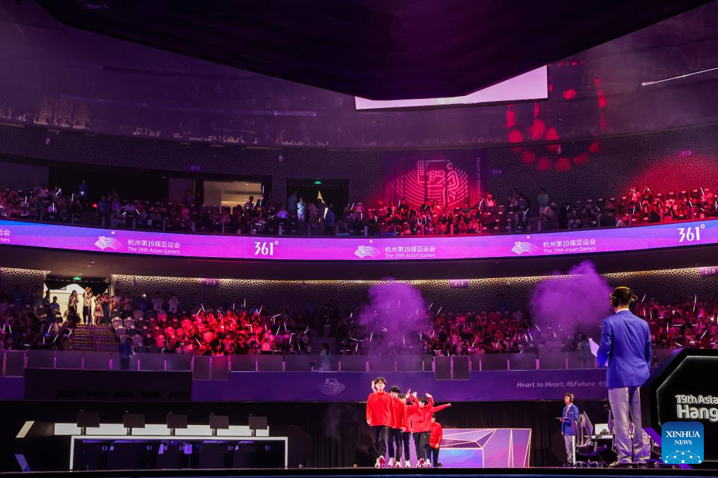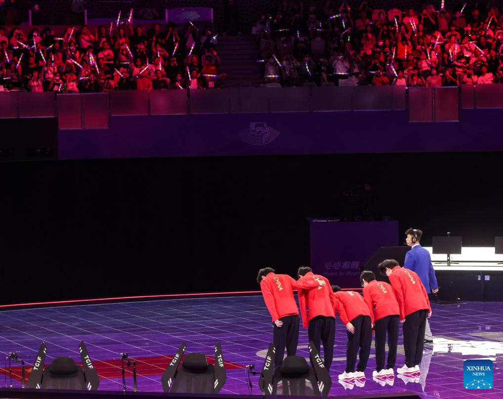 Players of team China gesture to the audience after the Arena of Valor Asian Games Version Quarterfinal match of Esports at the 19th Asian Games in Hangzhou, east China's Zhejiang Province, Sept. 24, 2023. (Xinhua/Hu Xingyu)