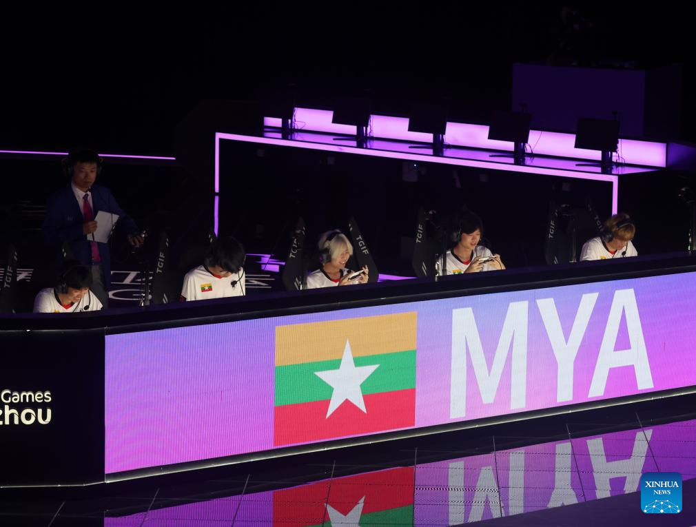 Players of team Myanmar compete during the Arena of Valor Asian Games Version Quarterfinal match of Esports at the 19th Asian Games in Hangzhou, east China's Zhejiang Province, Sept. 24, 2023. (Xinhua/Hu Xingyu)
