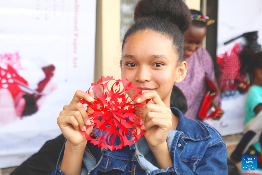 A girl shows her Chinese paper-cut work at a Chinese cultural exhibition in Kigali, Rwanda, Sept. 23, 2023. Hundreds of Rwandans and Chinese people living in Rwanda braved the afternoon bad weather to attend an action-packed Chinese cultural exhibition in Kigali, the capital of Rwanda, over the weekend. (Photo by Huang Wanqing/Xinhua)