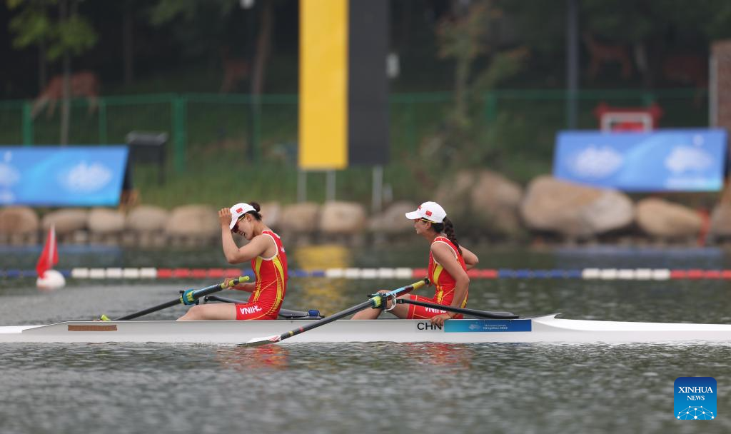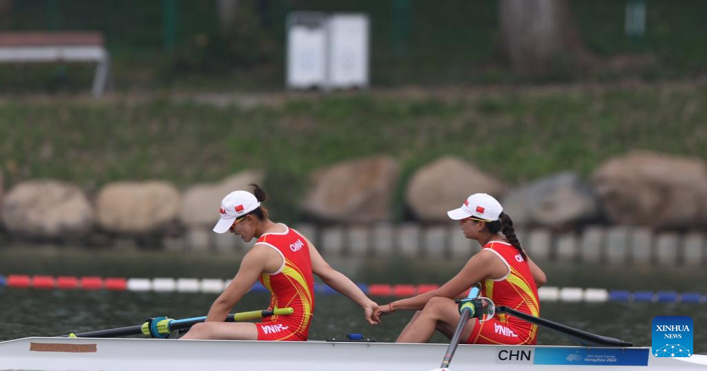 Wang Tingting (R) and Zhang Xuan of China celebrate after the Women's Pair Final of Rowing at the 19th Asian Games in Hangzhou, east China's Zhejiang Province, Sept. 25, 2023. (Xinhua/Du Xiaoyi)