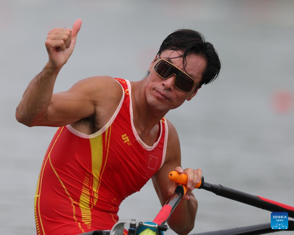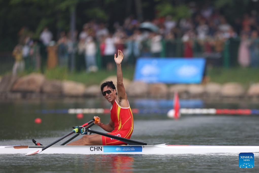 Zhang Liang of China celebrates after the Men's Single Sculls Final of Rowing at the 19th Asian Games in Hangzhou, east China's Zhejiang Province, Sept. 25, 2023. (Xinhua/Du Xiaoyi)