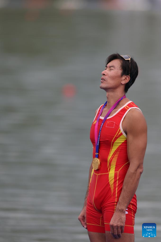 Zhang Liang of China attends the awarding ceremony for the Men's Single Sculls of Rowing at the 19th Asian Games in Hangzhou, east China's Zhejiang Province, Sept. 25, 2023. (Xinhua/Du Xiaoyi)