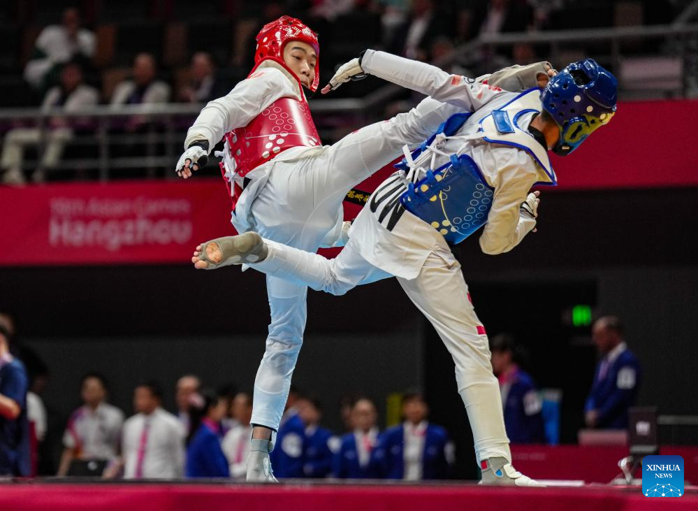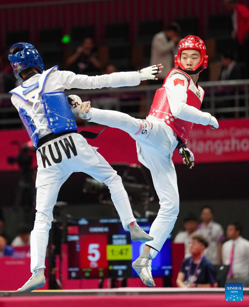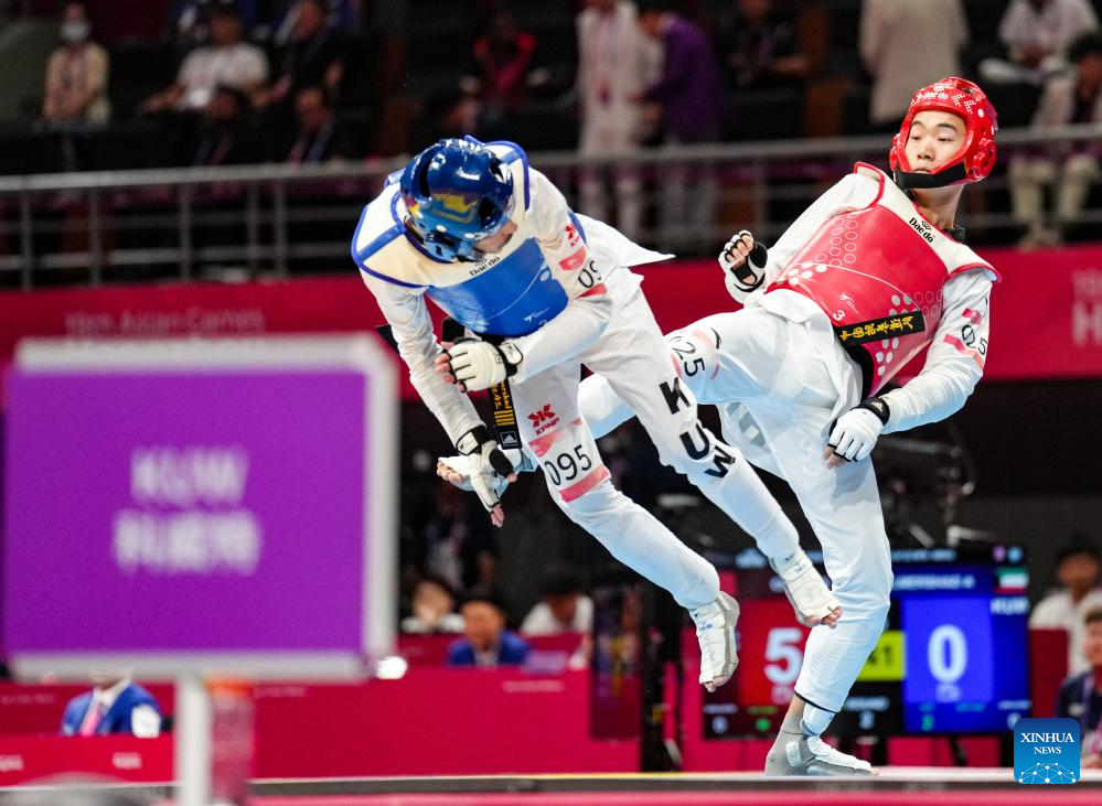 Cheng Kai (R) of China competes against Ali Almershad of Kuwait during the Taekwondo Men's 58kg Round of 32 at the 19th Asian Games in Hangzhou, east China's Zhejiang Province, Sept. 25, 2023. (Xinhua/Jiang Wenyao)