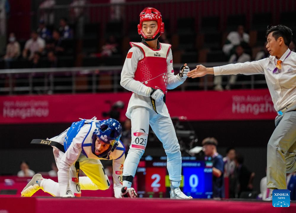 Cheng Kai (C) of China competes against Ali Almershad of Kuwait during the Taekwondo Men's 58kg Round of 32 at the 19th Asian Games in Hangzhou, east China's Zhejiang Province, Sept. 25, 2023. (Xinhua/Jiang Wenyao)