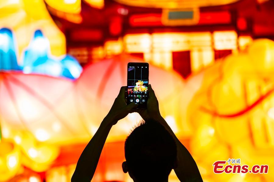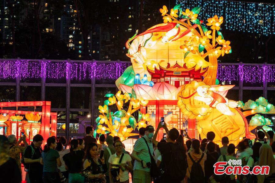 Visitors take photos of dazzling lanterns displayed at Victoria Park to celebrate the Mid-Autumn Festival in the Hong Kong Special Administrative Region, Sept. 24, 2023. (Photo: China News Service/Hou Yu)