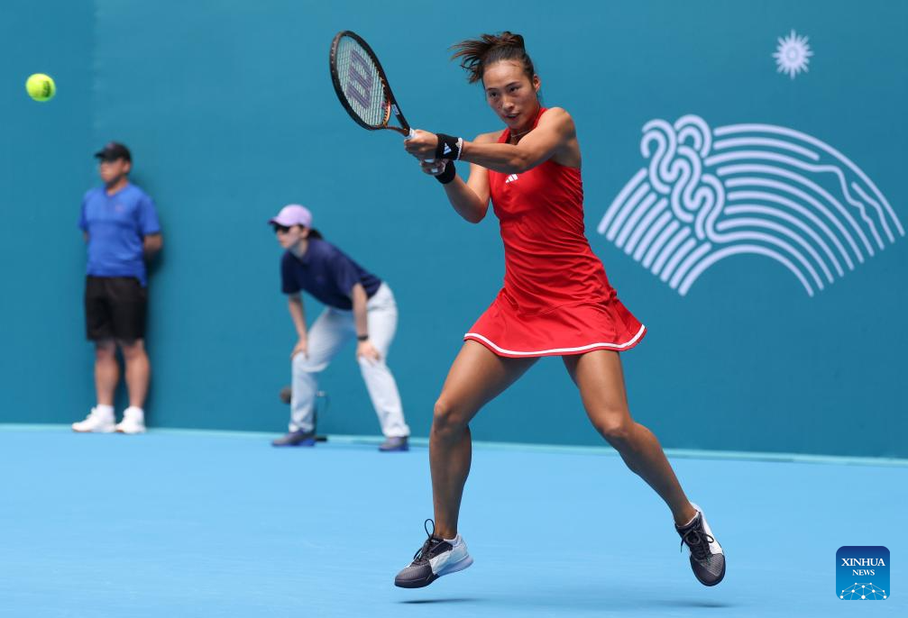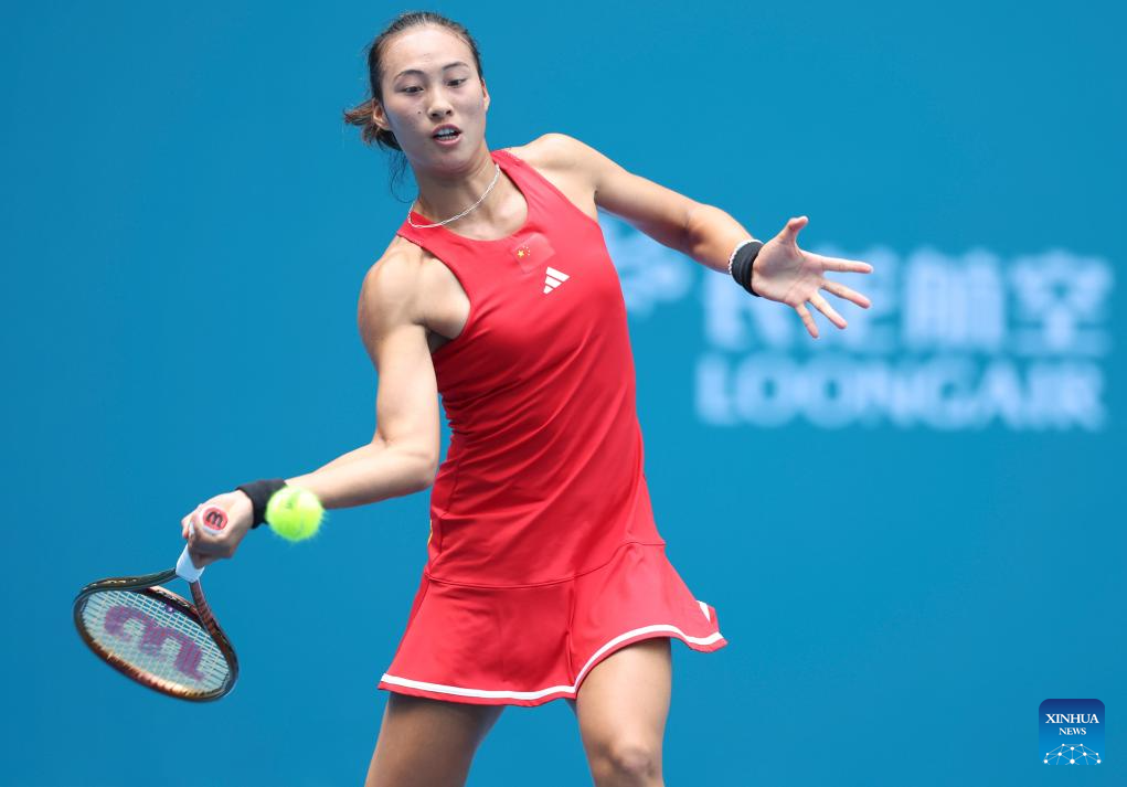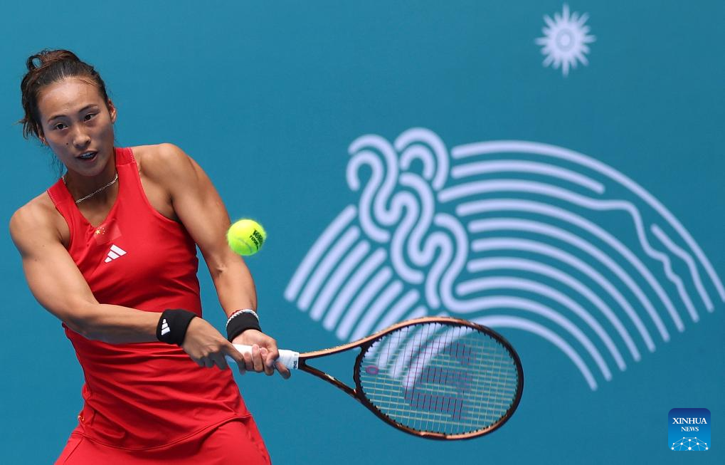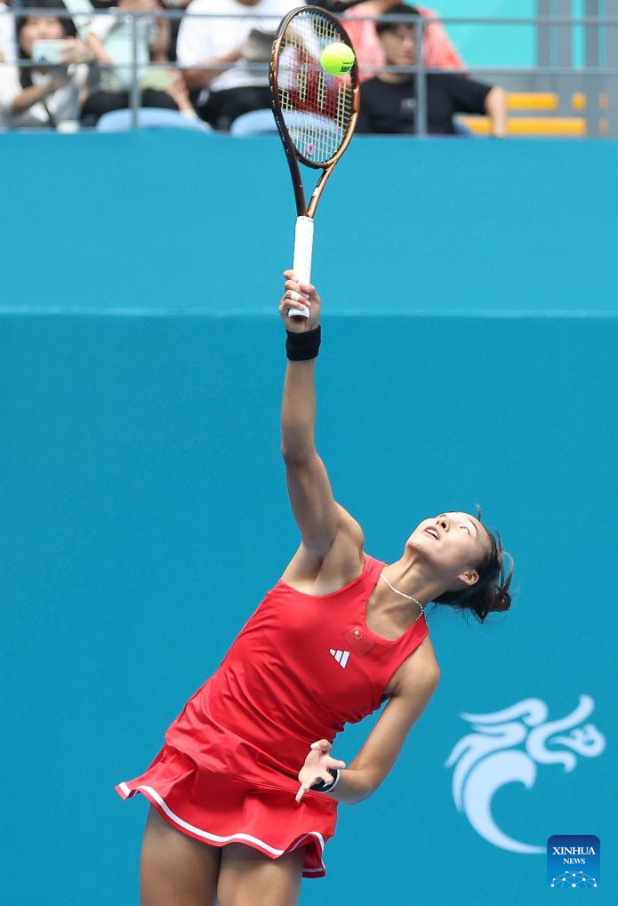 Zheng Qinwen of China competes during the Women's Singles of Tennis between Zheng Qinwen of China and Maralgoo Chogsomjav of Mongolia at the 19th Asian Games in Hangzhou, east China's Zhejiang Province, Sept. 25, 2023. (Xinhua/Meng Chenguang)