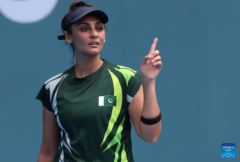 Ushna Suhail of Pakistan reacts during the Women's Singles of Tennis between Zhu Lin of China and Ushna Suhail of Pakistan at the 19th Asian Games in Hangzhou, east China's Zhejiang Province, Sept. 25, 2023. (Xinhua/Meng Chenguang)