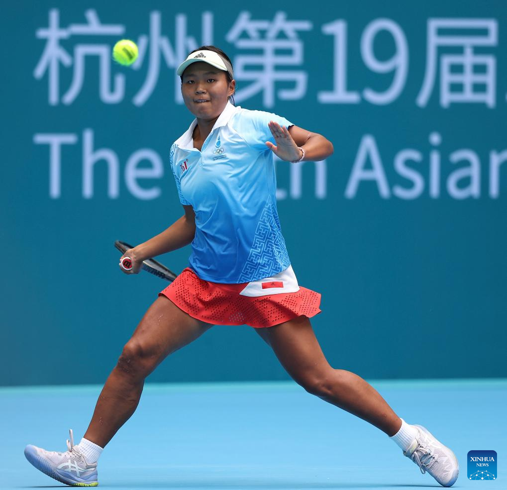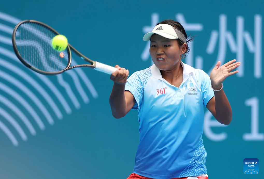 Maralgoo Chogsomjav of Mongolia competes during the Women's Singles of Tennis between Zheng Qinwen of China and Maralgoo Chogsomjav of Mongolia at the 19th Asian Games in Hangzhou, east China's Zhejiang Province, Sept. 25, 2023. (Xinhua/Meng Chenguang)